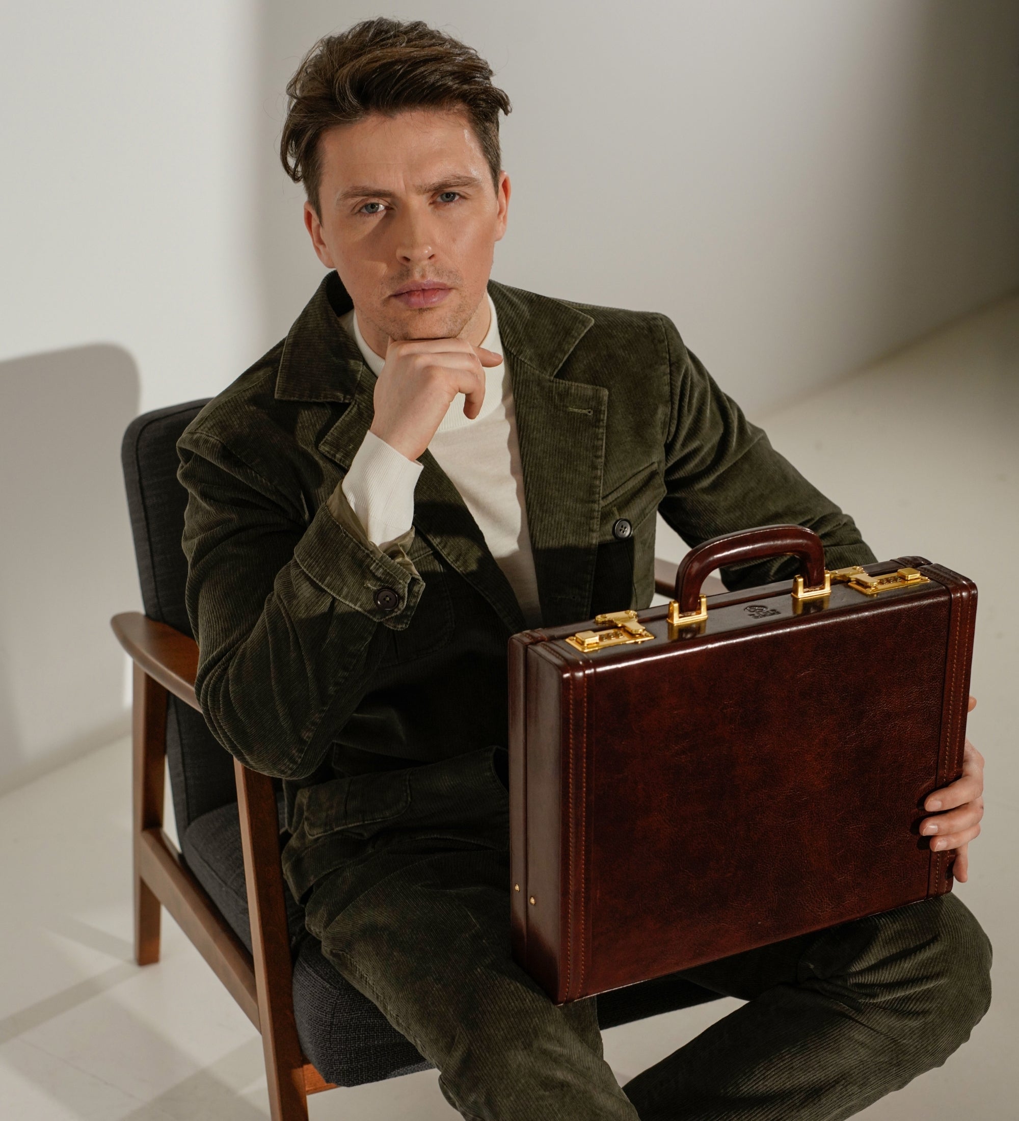 This premium leather attaché case is the perfect choice for the professional on the go. Expertly crafted from full-grain leather, this case features a classic design with plenty of room to securely store your laptop, documents, and other important items. The rich leather exterior is accented with gold color hardware, giving the bag a timeless look that will never go out of style. The interior is fully lined with a soft velvet. The combination lock provides additional security, giving you peace of mind that your items will stay safe and secure. Whether you're heading to the office or jet-setting around the world, this luxurious leather attaché case is the perfect companion.