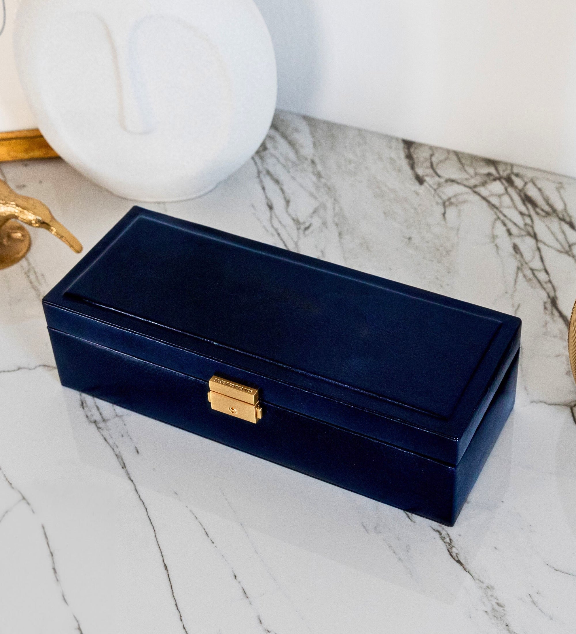 A leather watch box Herzog keeps your timepieces safe and sound. Made of full-grain Italian leather and extra soft velvet, this organizer has slots for four watches. A leather pocket is perfect for storing several watch straps or bracelets. A luxury watch holder can be a stylish accessory on a dresser or it can protect your precious collection of wristwatches while travelling. The box can be personalized with the initials of your loved one or even your favorite quote.