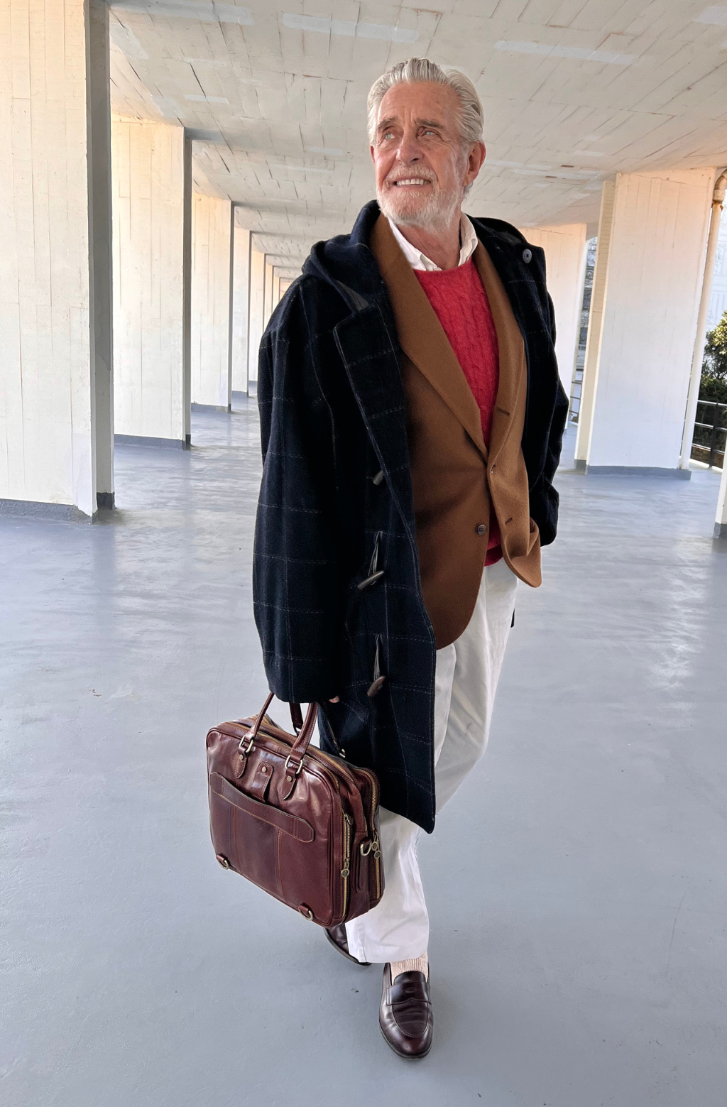A spacious briefcase for a heavy traveler. This full-grain Italian leather work bag has three compartments and lots of pockets for all your belongings. Carry it in hand, wear it on your shoulder, convert it into a backpack, or use the trolley strap to carry it on a suitcase. Innovative design, premium hand-dyed leather, and clean lines reflect the purpose of this briefcase, which is to make things happen while in style.