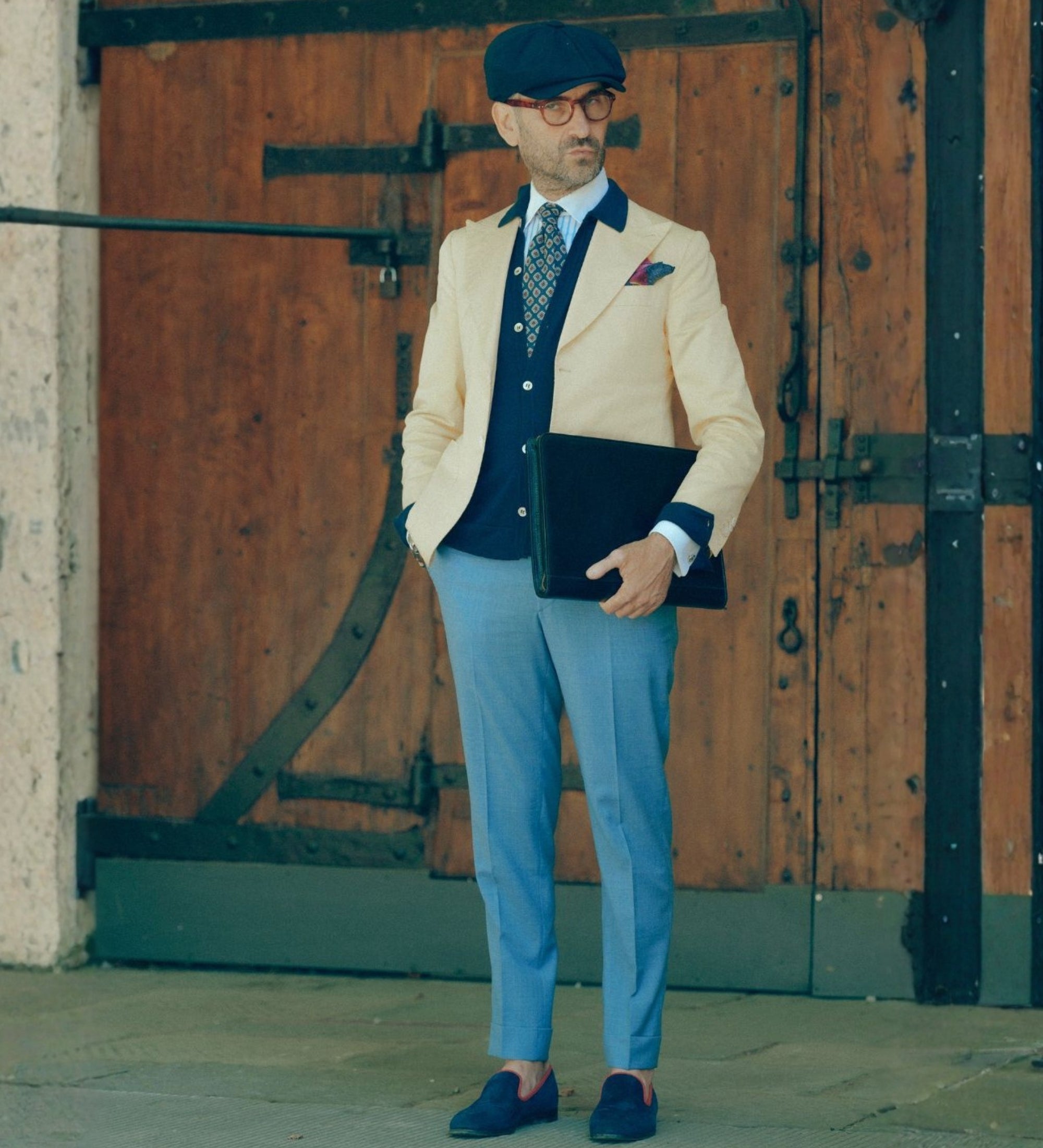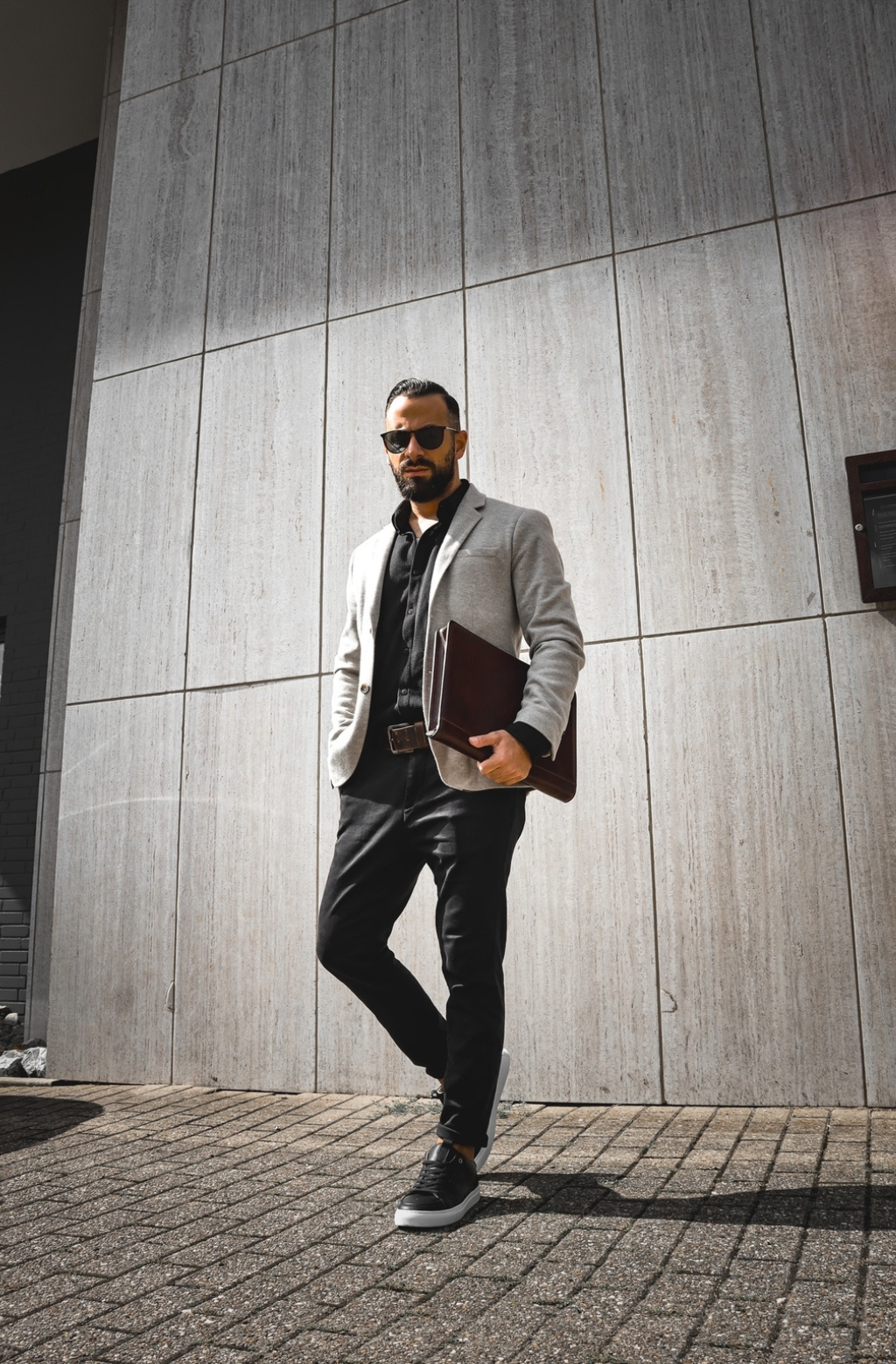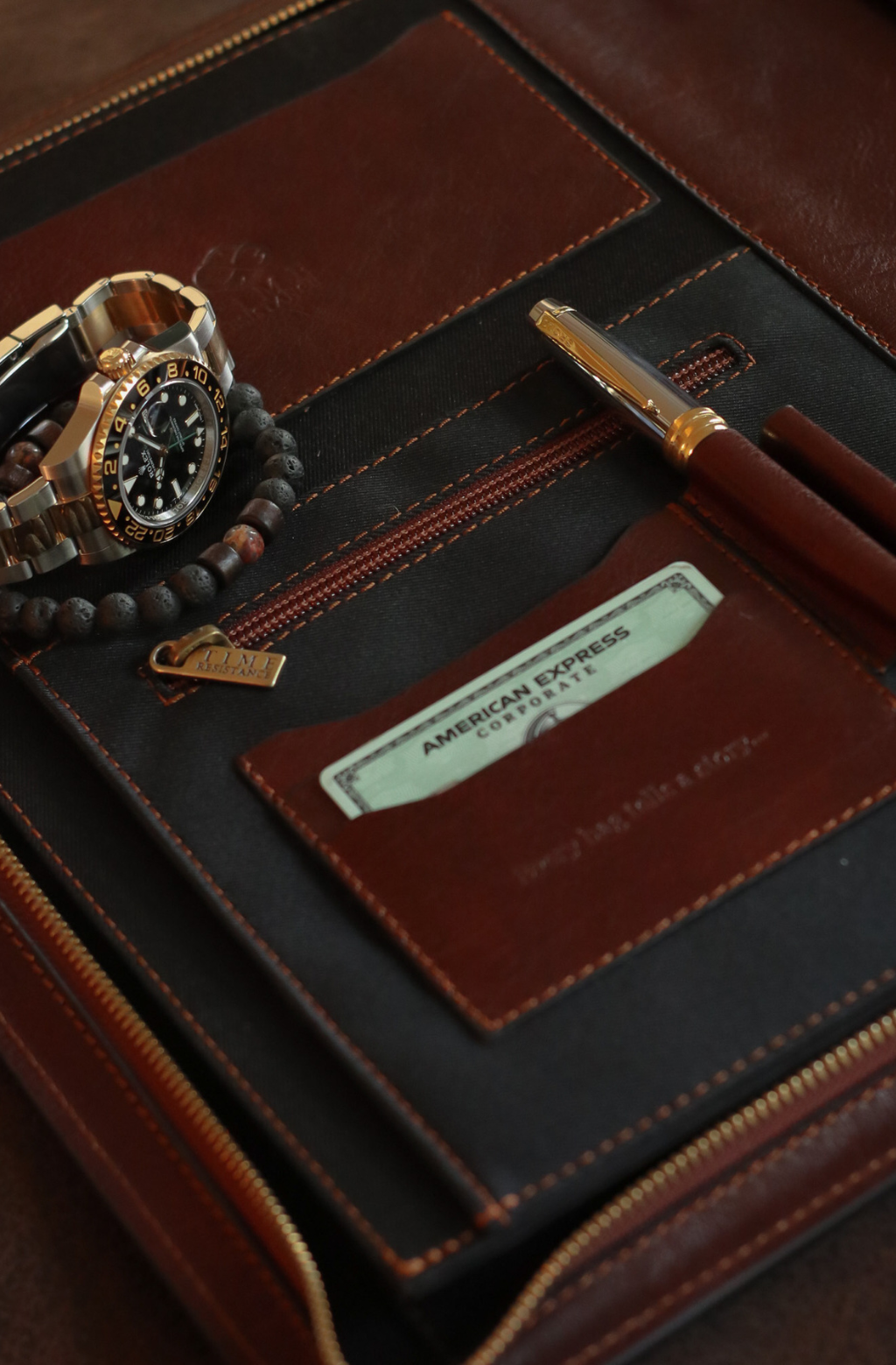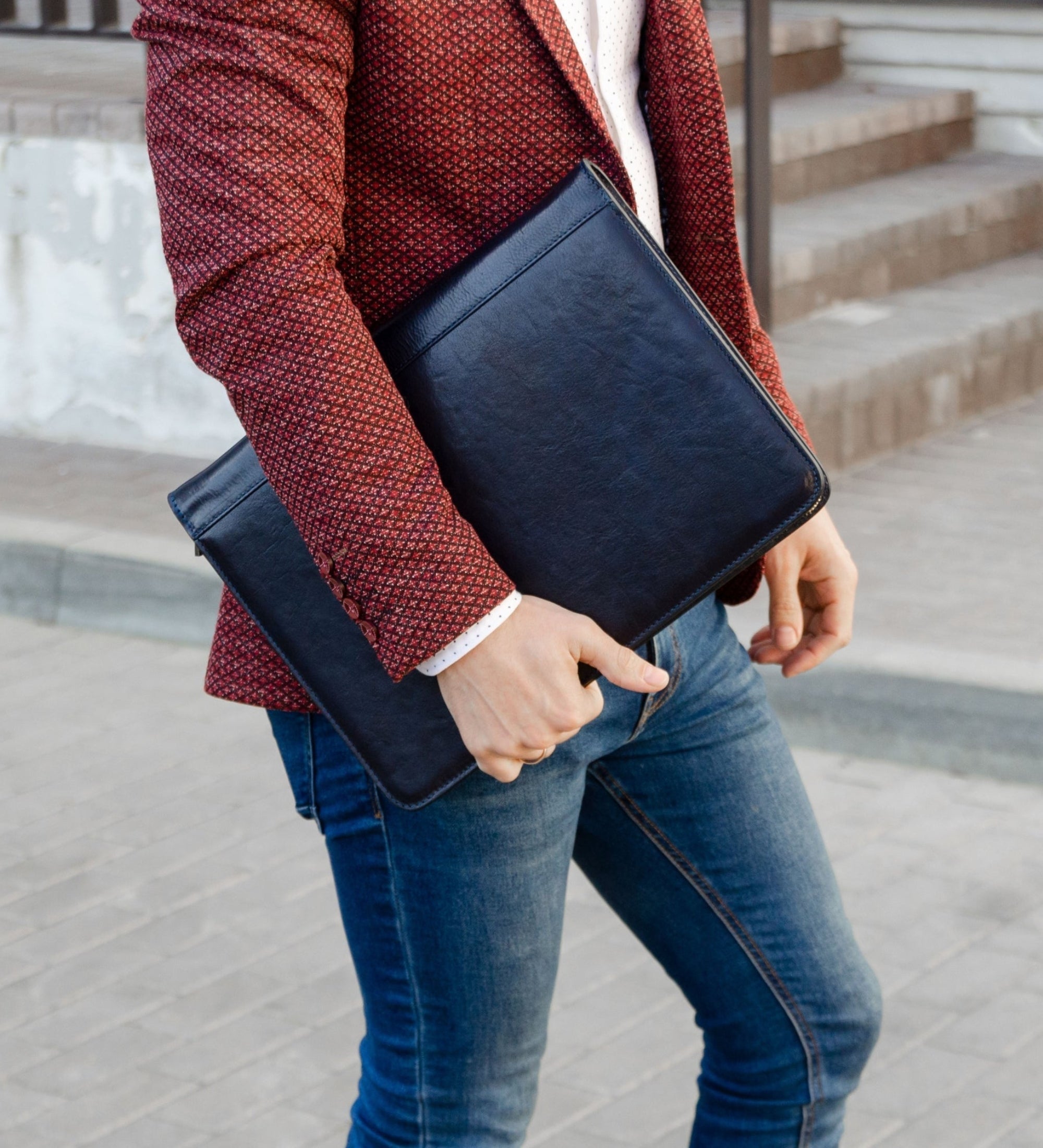 A solid full-grain leather documents folder that will complete a sleek minimalist business look. To organize your files and digital devices but keep a light, effortless chic appearance.