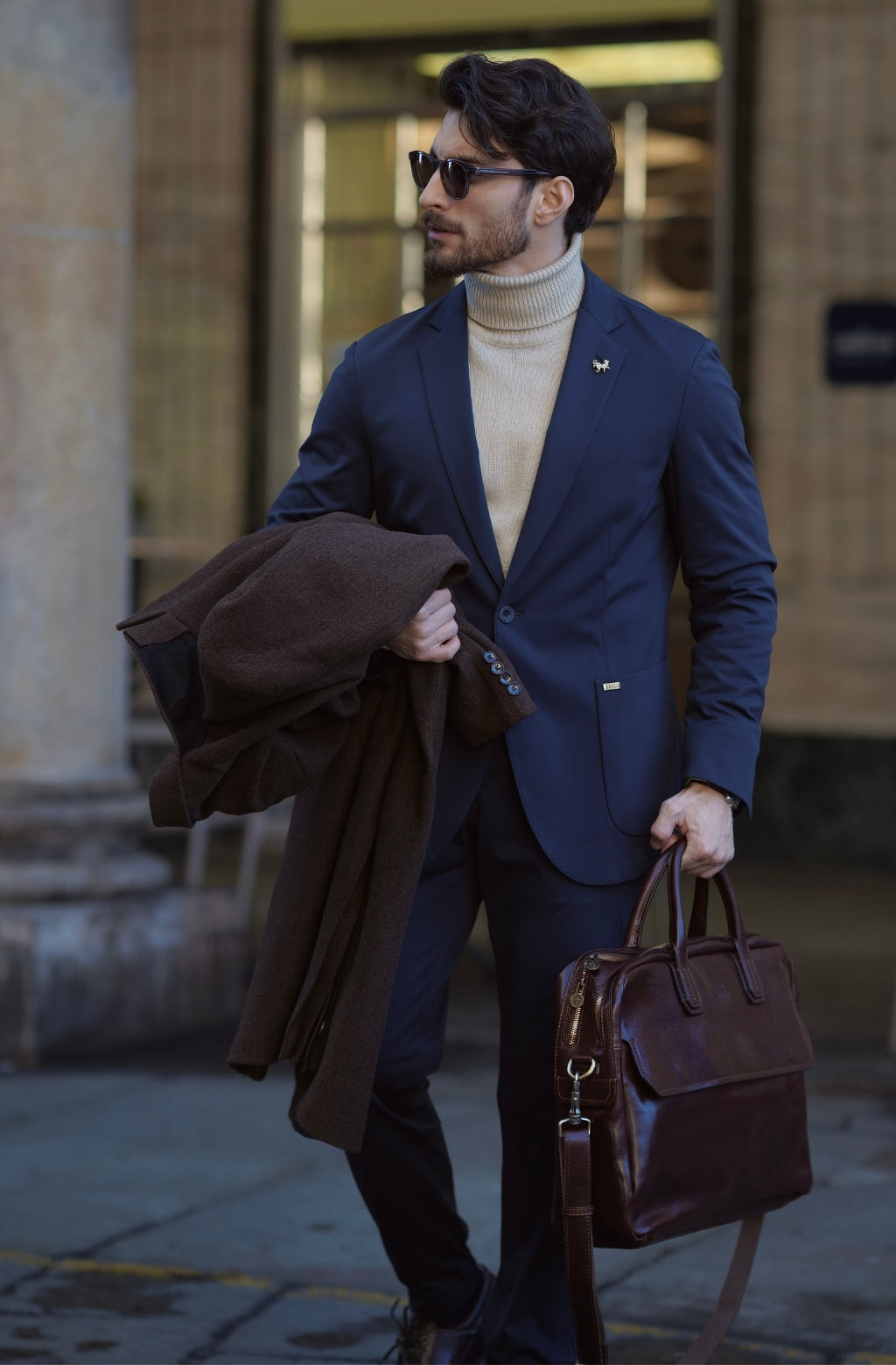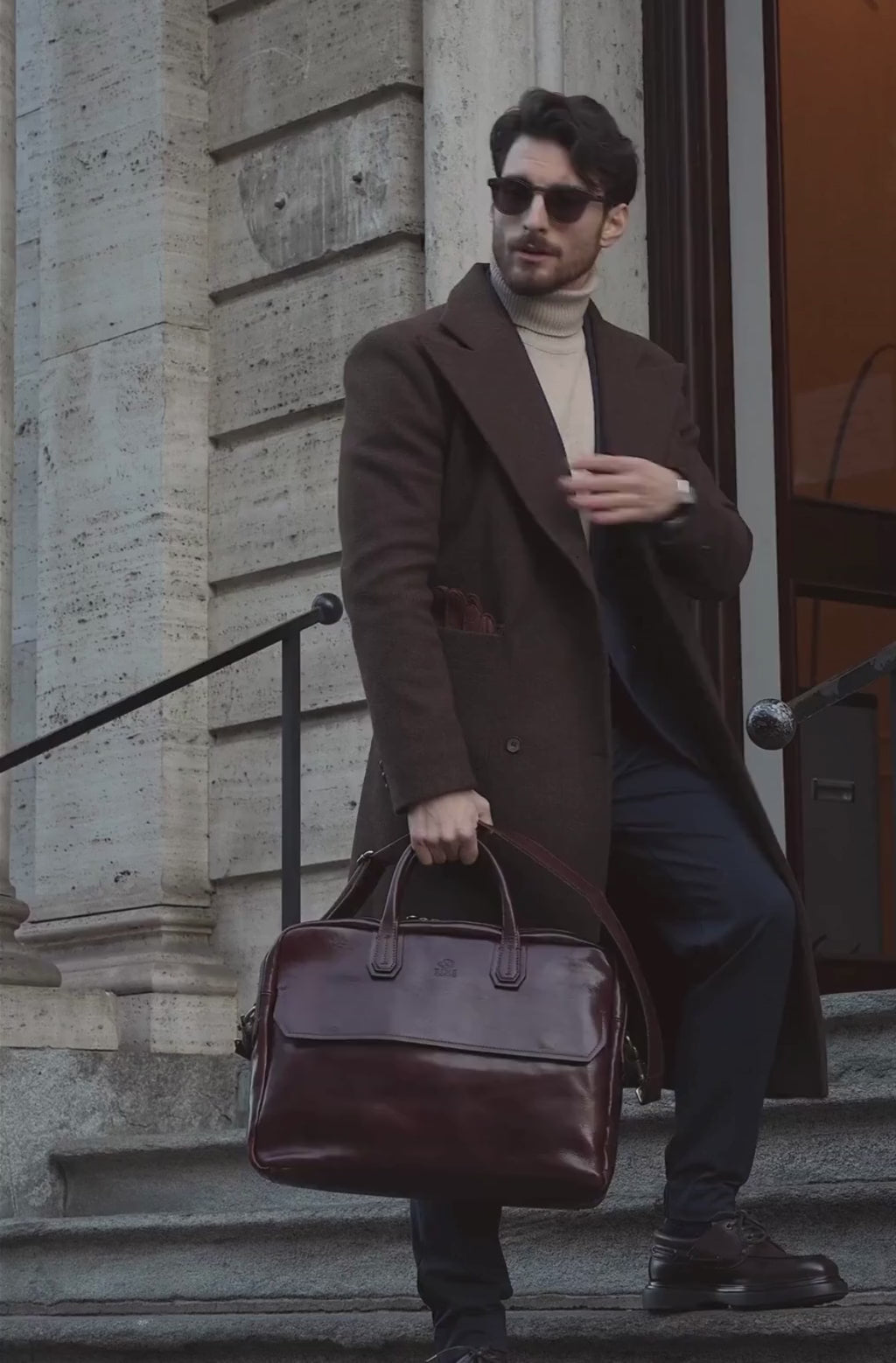 A large leather briefcase Nostromo fits everything you need. Hand-made of full-grain Italian leather the briefcase with a trolley strap and a detachable shoulder strap is a perfect travel companion. Two spacious compartments fit legal size paper, A4 size documents, and folders. In addition, it safely accommodates a 17-inch laptop, and a tablet as padded pockets protect from bumps and scratches. The work bag has plenty of slip pockets and a large zip pocket inside. If that is not enough- we made an additional pocket with a flap on the front and a slip pocket with an extra-strong magnetic closure on the back – ideal for belongings that you need easy access to.