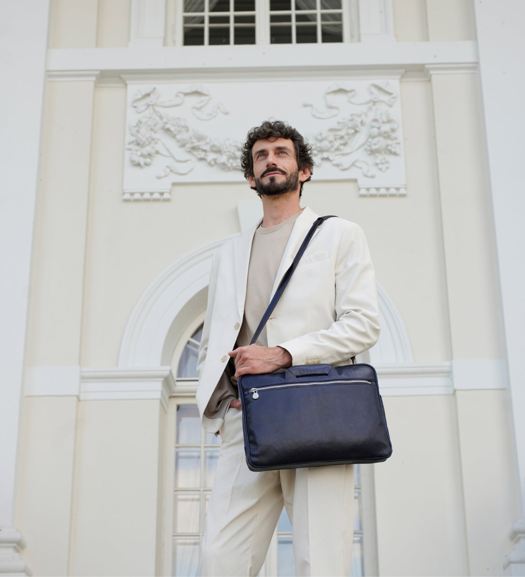 A full-grain leather briefcase that expresses perfect harmony between hard and soft. Top quality hand-dyed leather gives a sentimental feel, but the lines convey a light touch of modern. Timeless and current. Manly and feminine. Urban practicality with charisma.