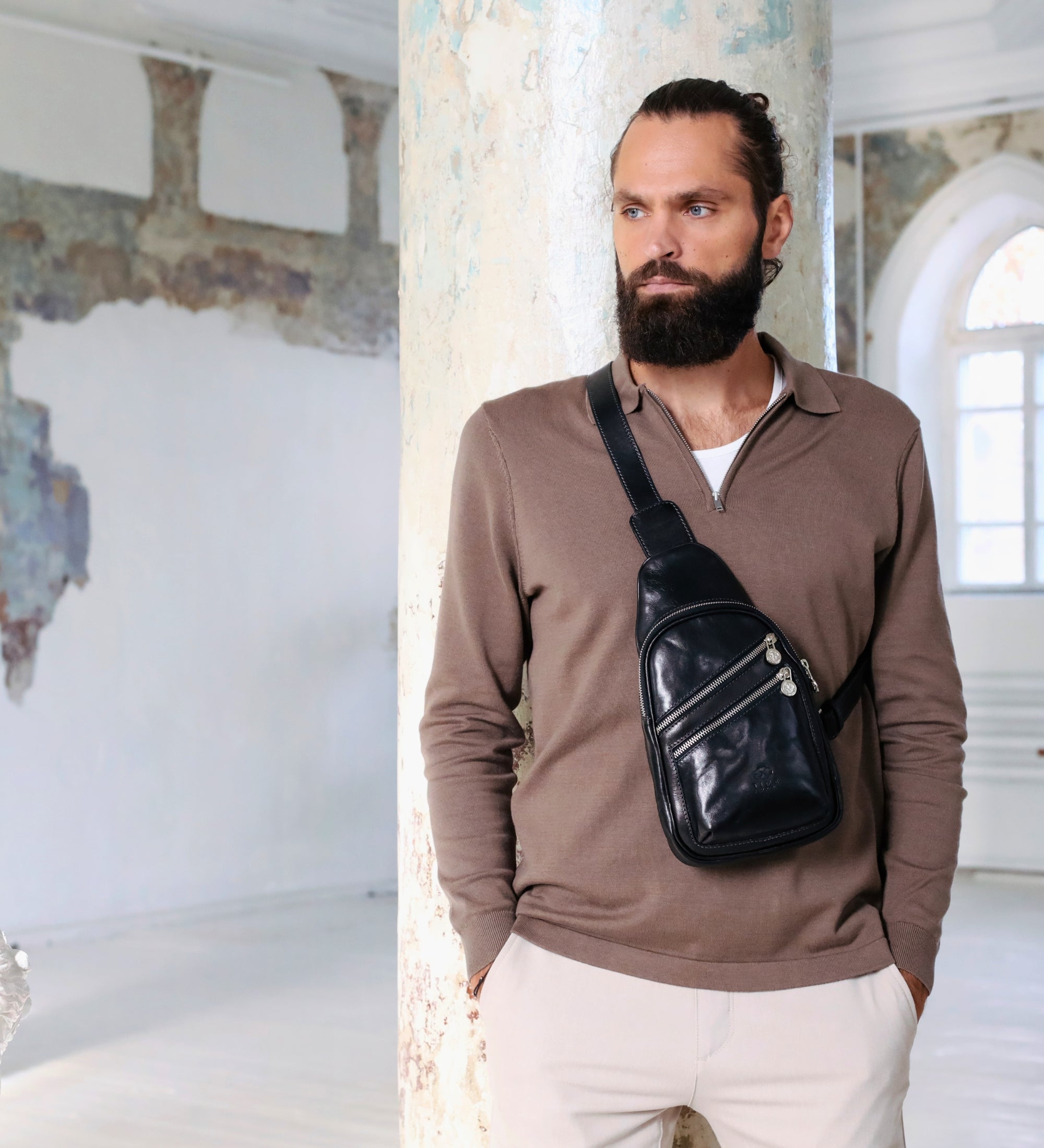 This Italian leather sling bag was designed to maximize the comfort of traveling. Our full-grain leather chest bag Catch-22 can be carried on the chest and on the back. Close to the body premium quality fanny pack does not restrain movements nor spirit of traveling.