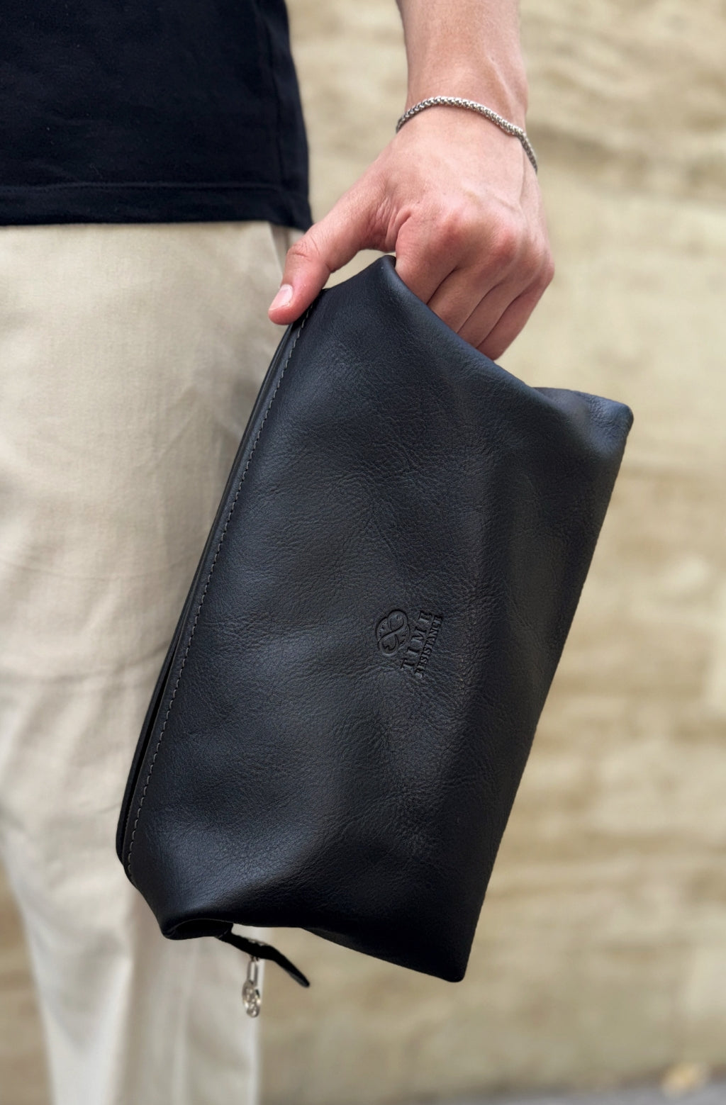 A full-grain leather wash bag is roomy enough to fit all your daily necessities with an inside pocket and a frame that allows for full opening for convenient access.