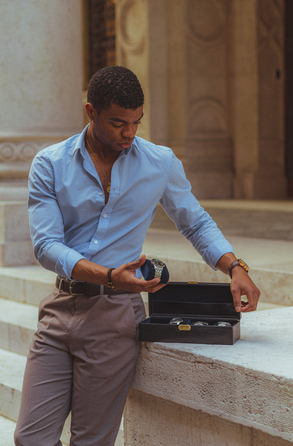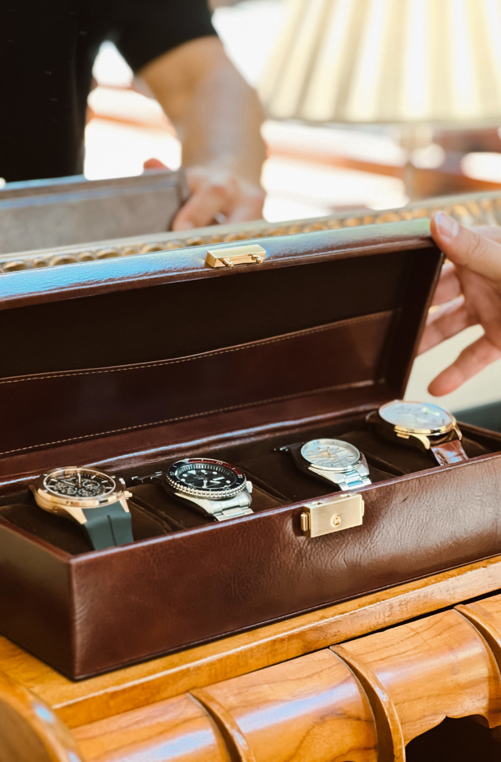 A leather watch box Herzog keeps your timepieces safe and sound. Made of full-grain Italian leather and extra soft velvet, this organizer has slots for four watches. A leather pocket is perfect for storing several watch straps or bracelets. A luxury watch holder can be a stylish accessory on a dresser or it can protect your precious collection of wristwatches while travelling. The box can be personalized with the initials of your loved one or even your favorite quote.