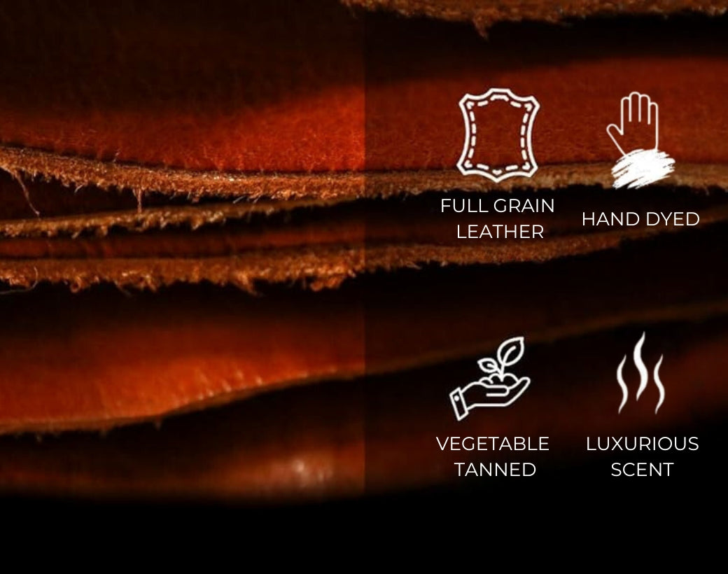 Vegetable tanning is a time-honored, plant-based method that has been used since the Early Bronze Age. Natural tannins from tree bark and leaves slowly transform leather without any harmful chemicals, preserving its authentic strength and character.