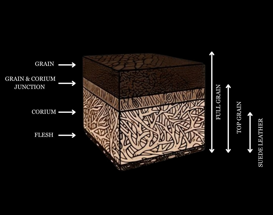 Full-grain leather is the strongest and most durable, as it includes the entire grain layer shown at the very top of the hide in the diagram. This top layer has the densest, most tightly packed fibers, which makes full-grain leather more resistant to wear, stretching, and moisture while aging beautifully.