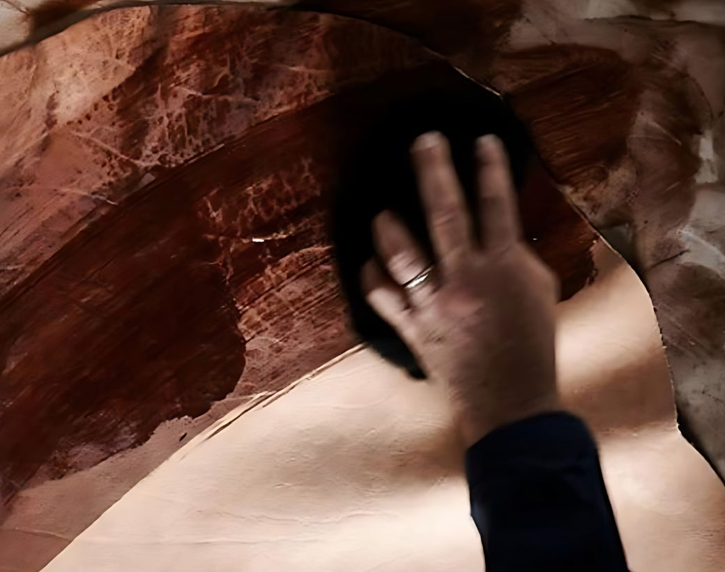 Hand dyeing is a slow, meticulous craft where every hide is colored by hand, layer by layer, using gentle circular motions. Instead of machines, it is the artisan’s touch that controls depth, warmth, and character. The dye is massaged into the grain, allowing the leather to breathe, absorb, and reveal its natural variations.