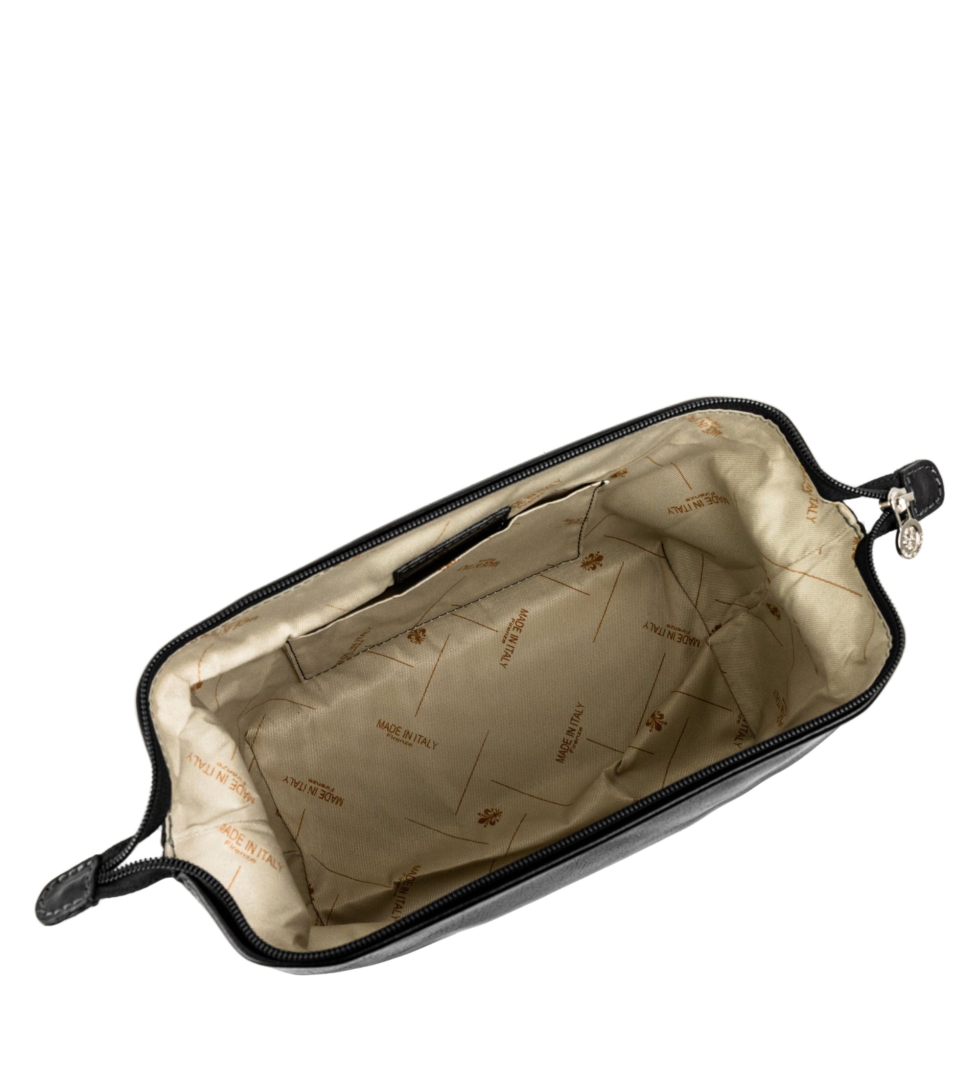 A full-grain leather wash bag is roomy enough to fit all your daily necessities with an inside pocket and a frame that allows for full opening for convenient access.