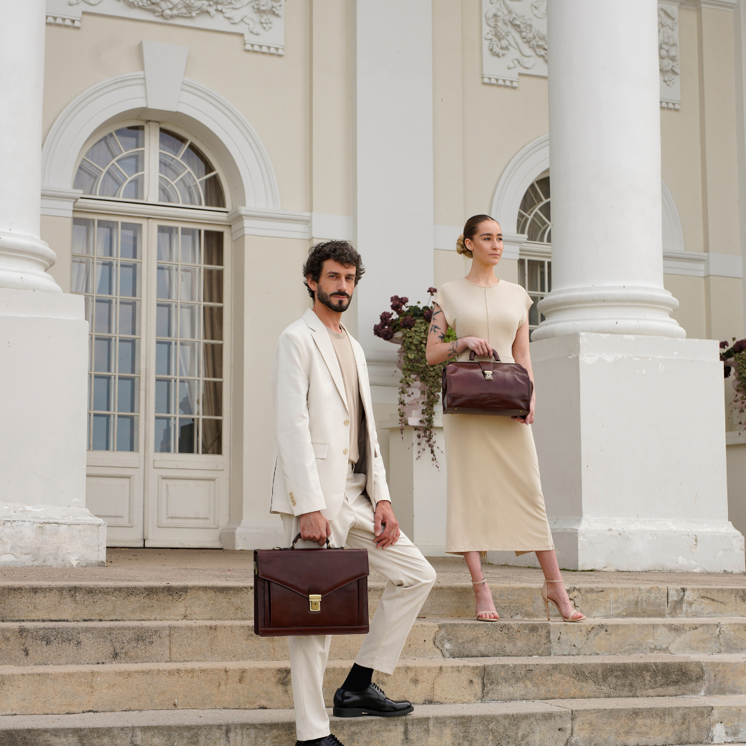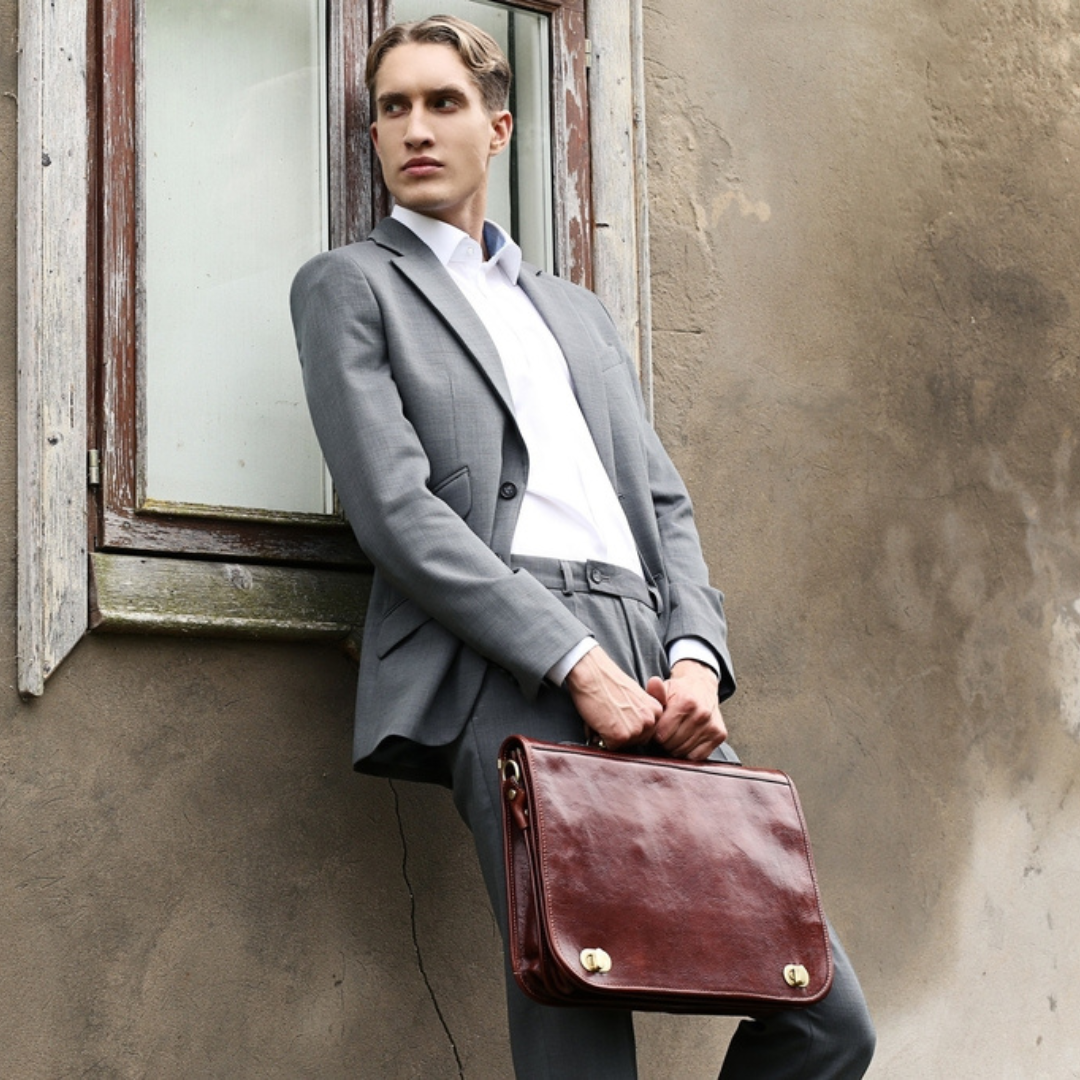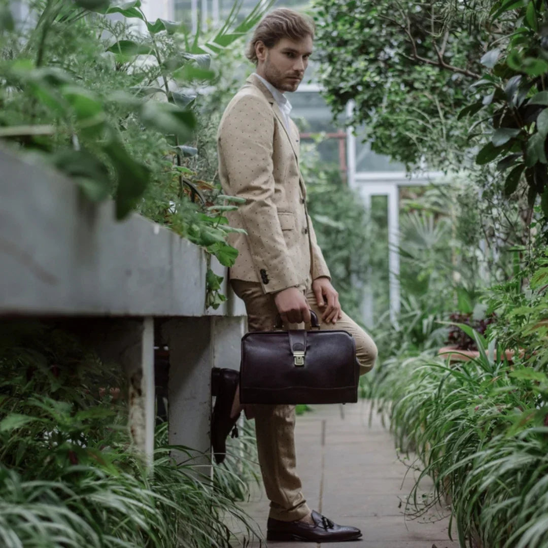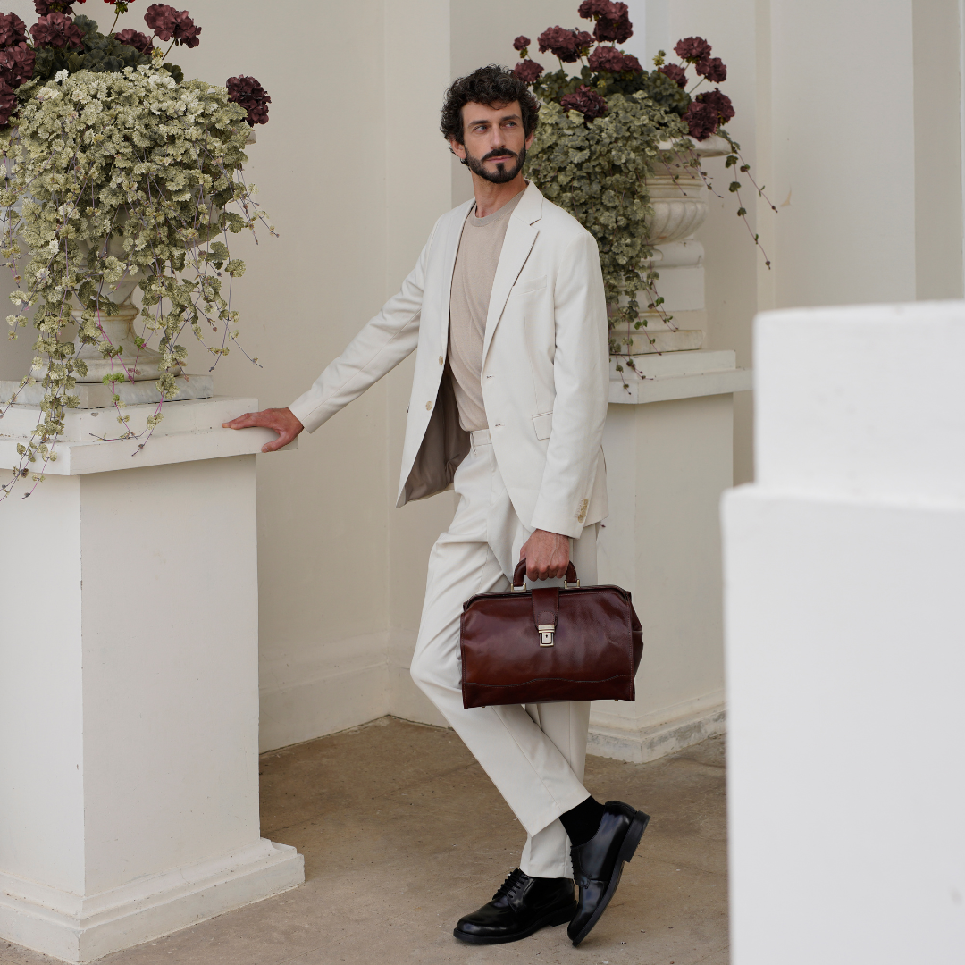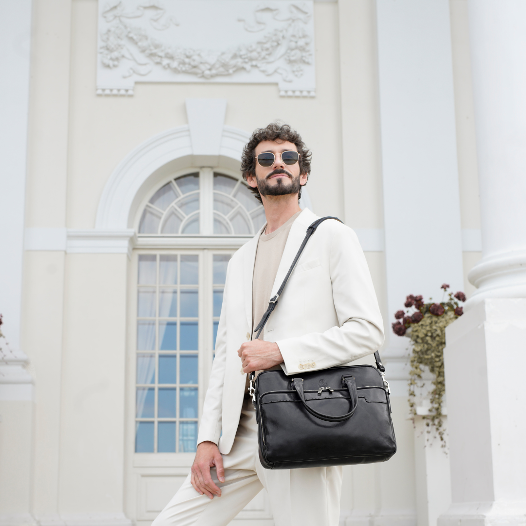 This spring, we invite you to experience a new kind of love: a love between you and your bag. Our latest photoshoot is a tribute to this special bond that transcends time and space. Our leather bags are more than just accessories. They are companions, confidants, and soulmates. They reflect your inner beauty and express your outer style. They are with you through thick and thin, through joy and sorrow, through work and play. They are the ones who make you feel alive and complete. Our photoshoot captures the magic of spring: the freshness of the air, the warmth of the sun, the vibrancy of the city. The model is a vision of elegance and charm, wearing a suit that matches his bags and his mood. The background is a stunning contrast of light and dark, with subtle touches of modernity and history. The photoshoot is a romance between you and your bag. It shows that you don’t need anyone else to make you happy. You just need yourself and your bag. So go ahead and indulge in a spring fling with our leather bags.