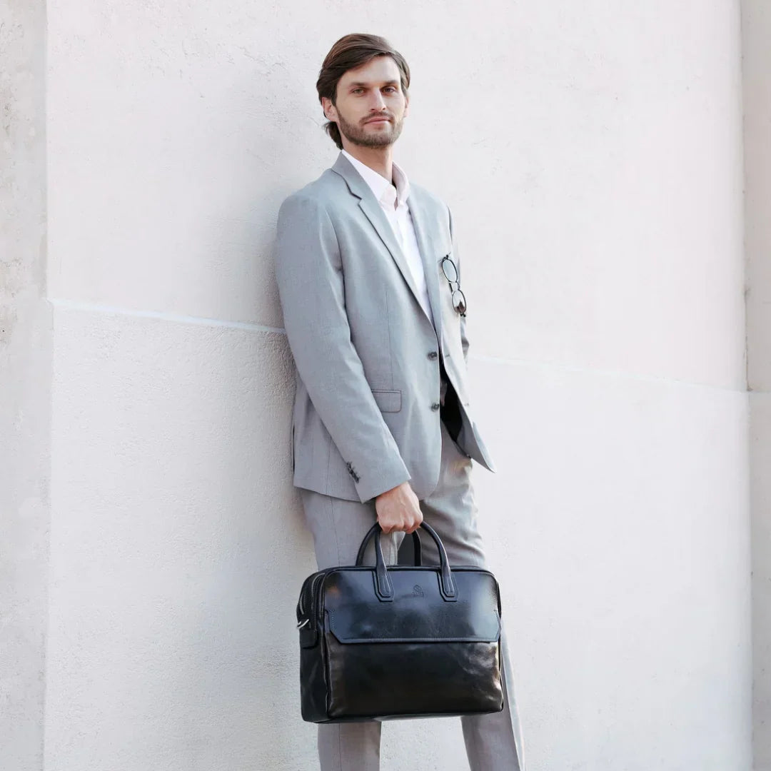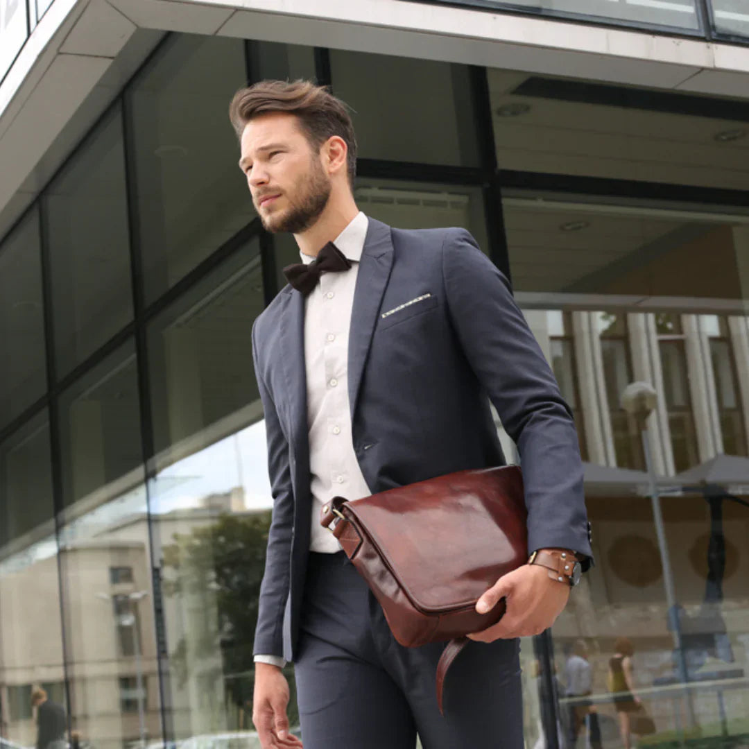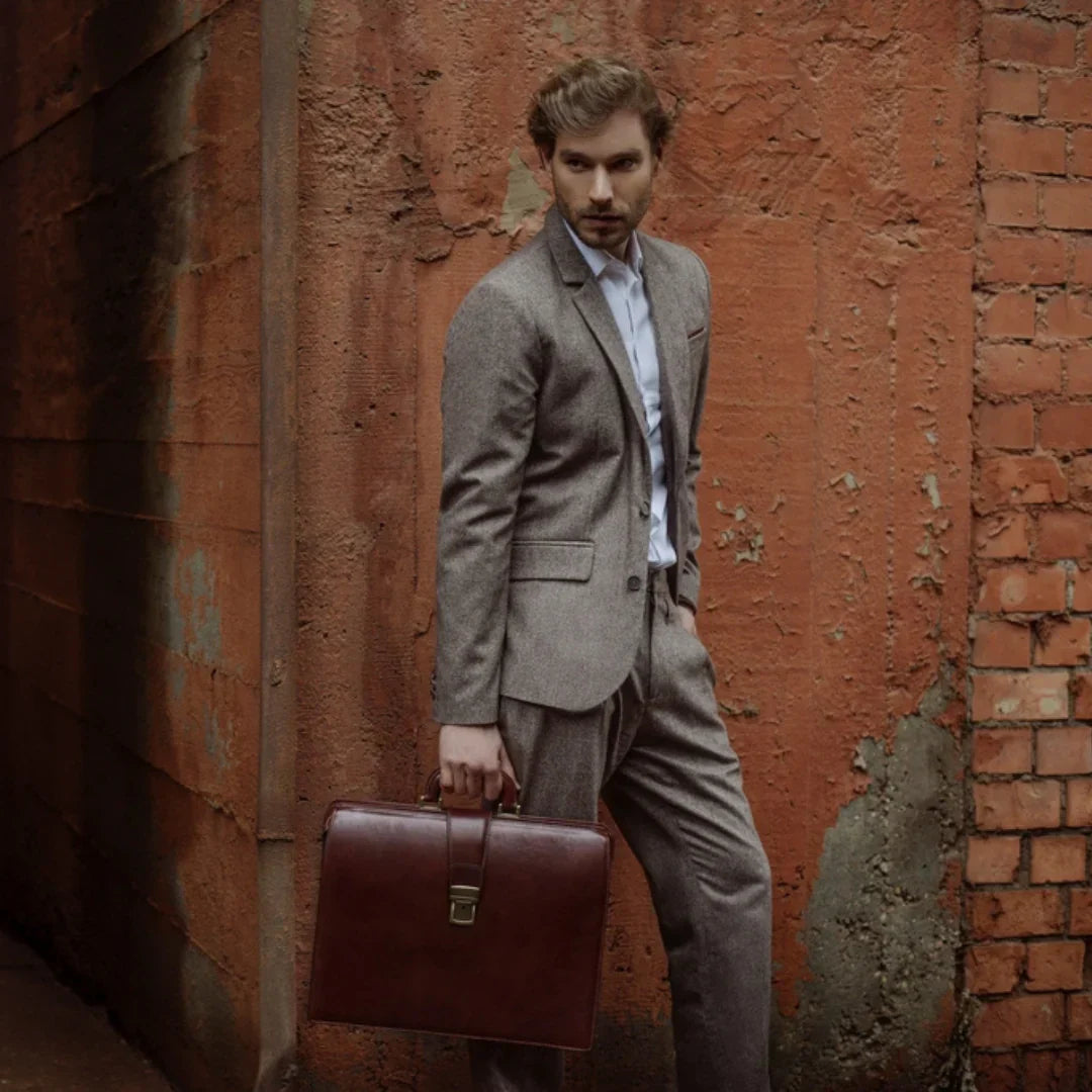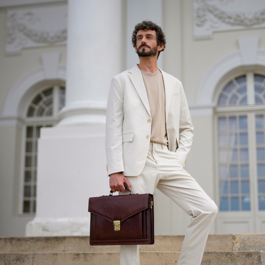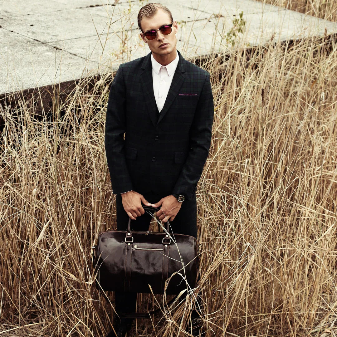 This spring, we invite you to experience a new kind of love: a love between you and your bag. Our latest photoshoot is a tribute to this special bond that transcends time and space. Our leather bags are more than just accessories. They are companions, confidants, and soulmates. They reflect your inner beauty and express your outer style. They are with you through thick and thin, through joy and sorrow, through work and play. They are the ones who make you feel alive and complete. Our photoshoot captures the magic of spring: the freshness of the air, the warmth of the sun, the vibrancy of the city. The model is a vision of elegance and charm, wearing a suit that matches his bags and his mood. The background is a stunning contrast of light and dark, with subtle touches of modernity and history. The photoshoot is a romance between you and your bag. It shows that you don’t need anyone else to make you happy. You just need yourself and your bag. So go ahead and indulge in a spring fling with our leather bags.