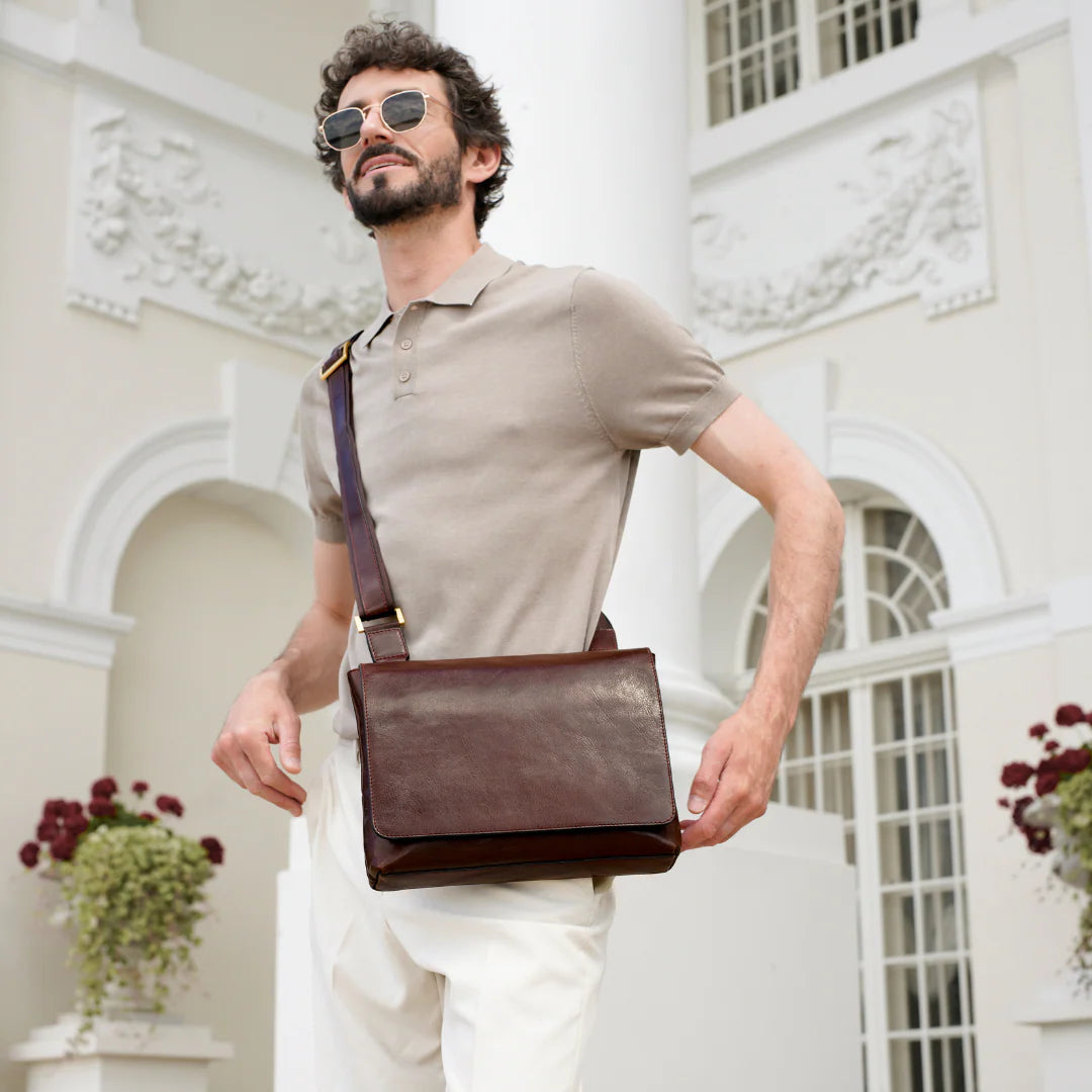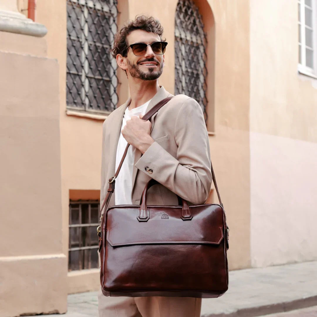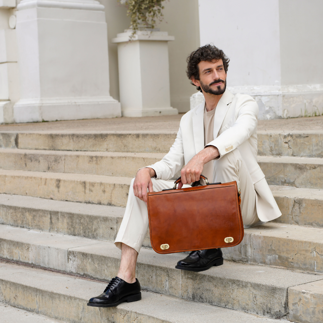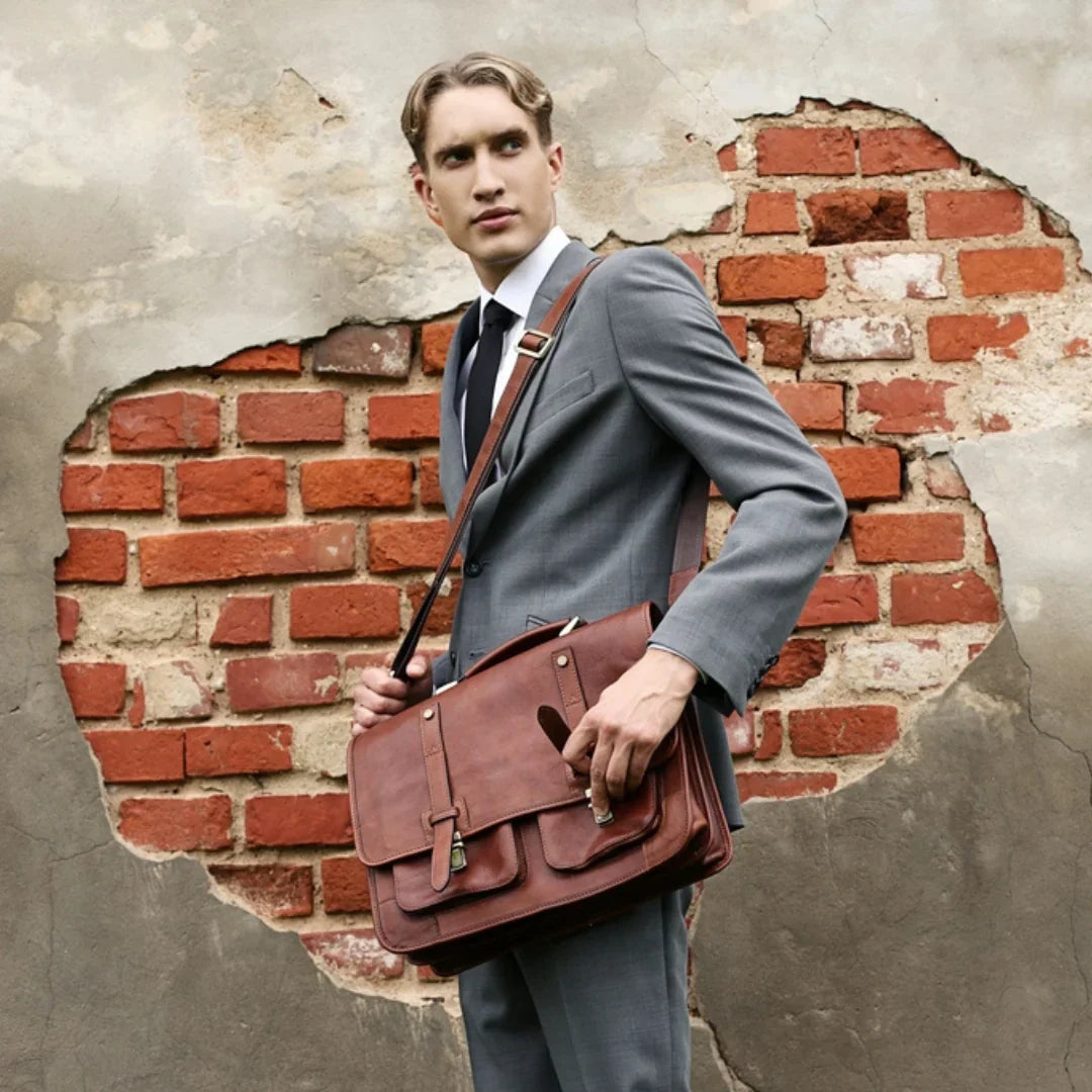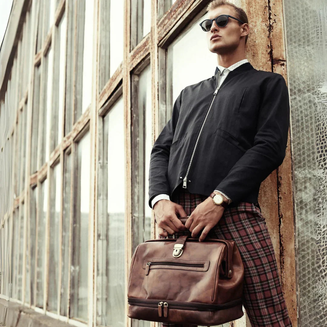 This spring, we invite you to experience a new kind of love: a love between you and your bag. Our latest photoshoot is a tribute to this special bond that transcends time and space. Our leather bags are more than just accessories. They are companions, confidants, and soulmates. They reflect your inner beauty and express your outer style. They are with you through thick and thin, through joy and sorrow, through work and play. They are the ones who make you feel alive and complete. Our photoshoot captures the magic of spring: the freshness of the air, the warmth of the sun, the vibrancy of the city. The model is a vision of elegance and charm, wearing a suit that matches his bags and his mood. The background is a stunning contrast of light and dark, with subtle touches of modernity and history. The photoshoot is a romance between you and your bag. It shows that you don’t need anyone else to make you happy. You just need yourself and your bag. So go ahead and indulge in a spring fling with our leather bags.