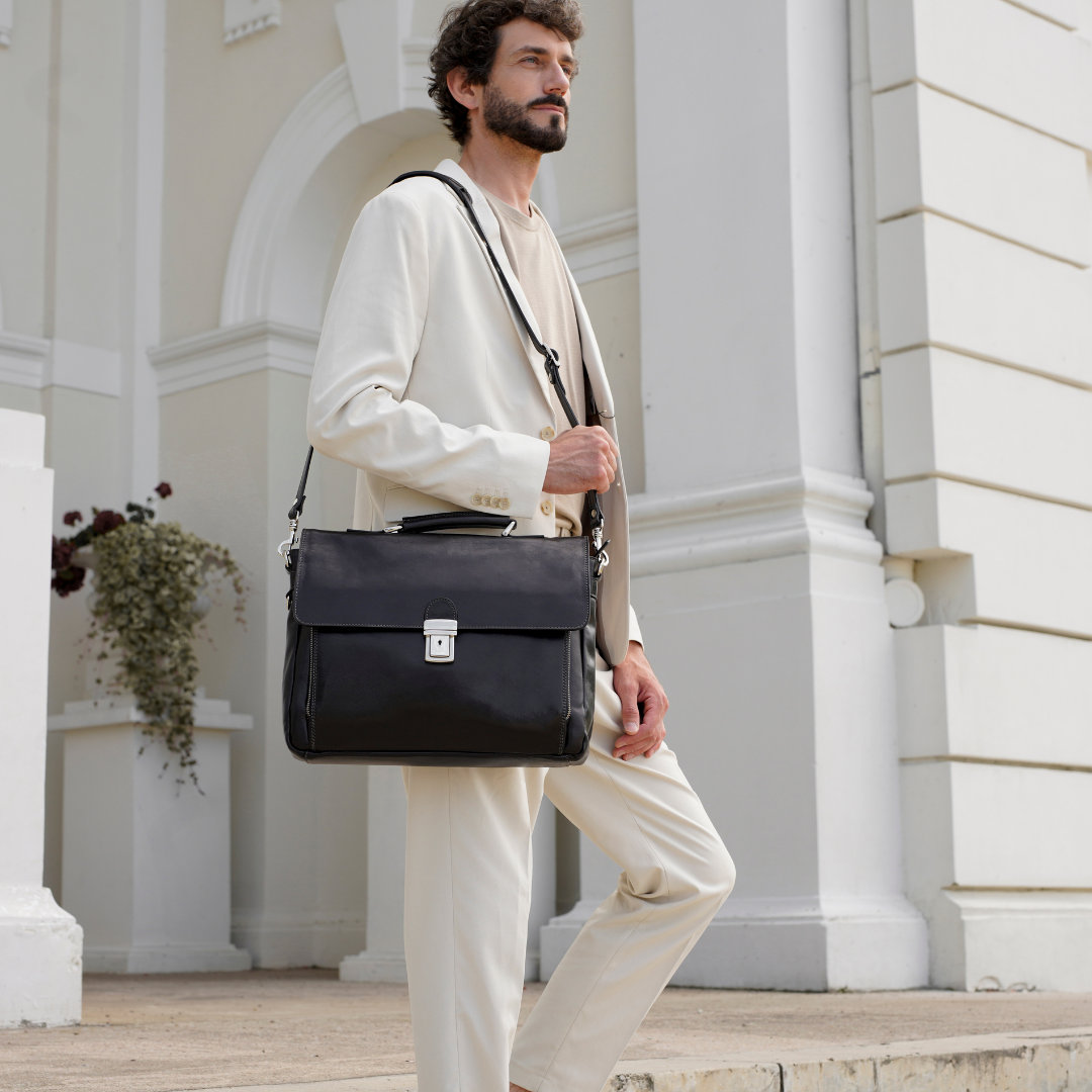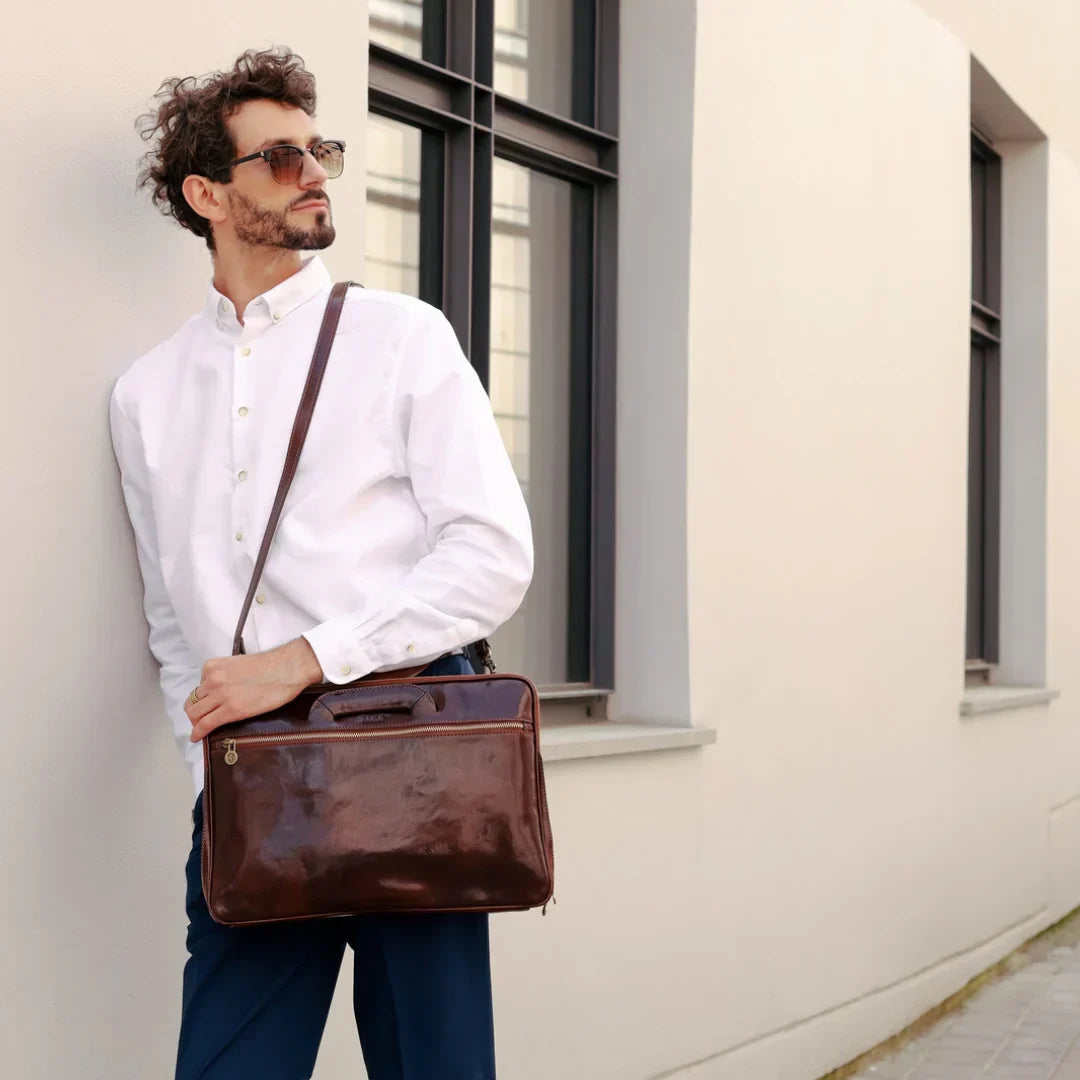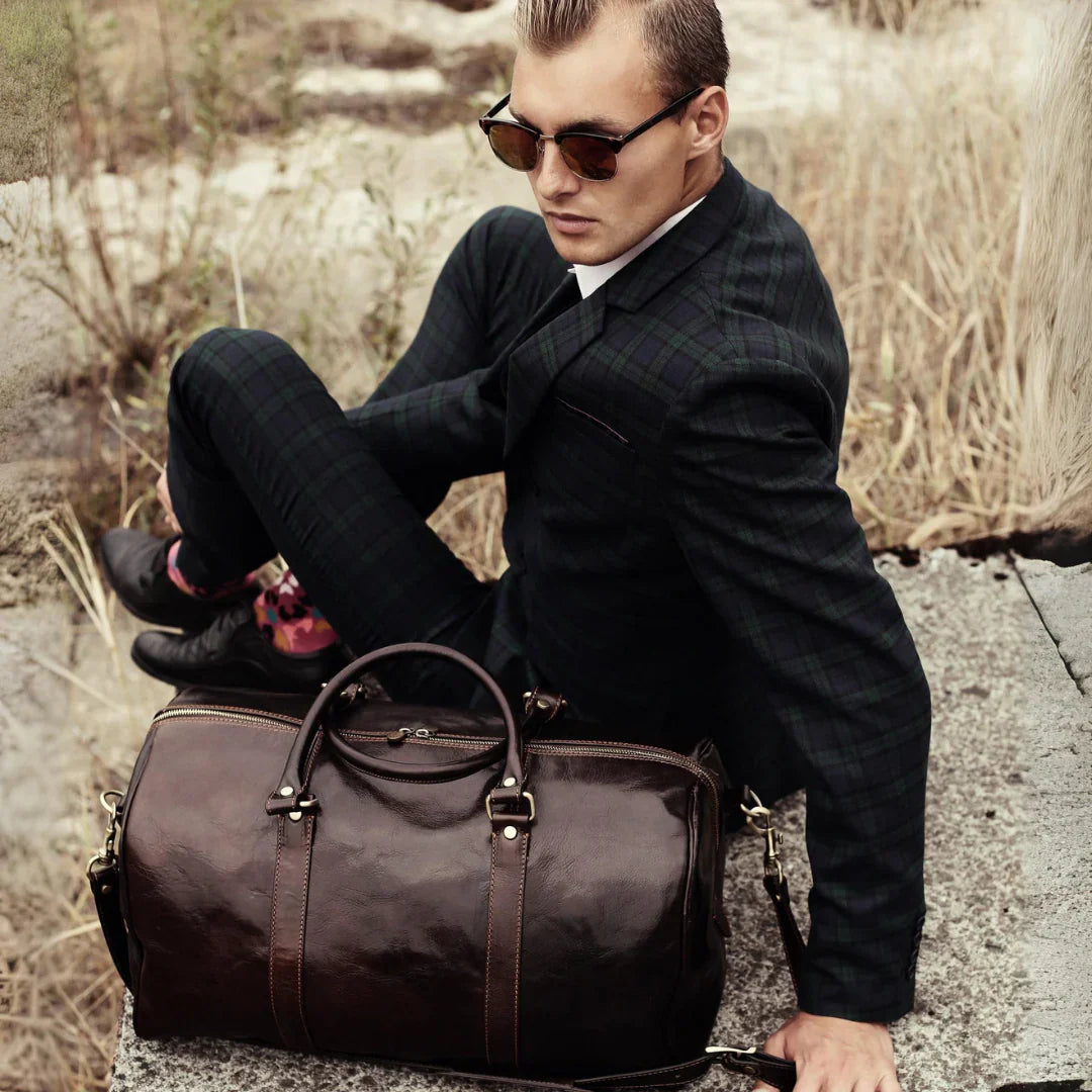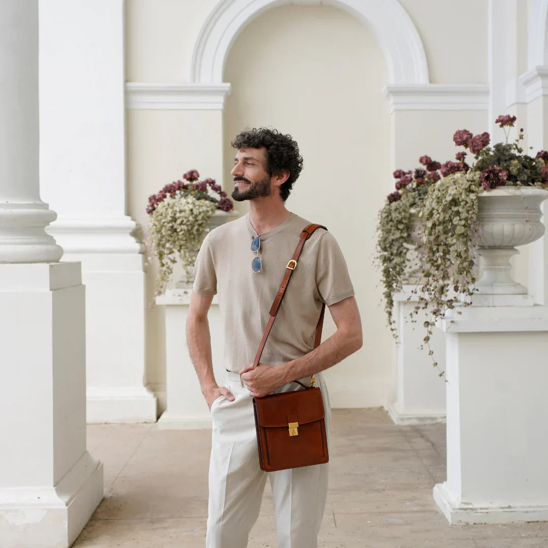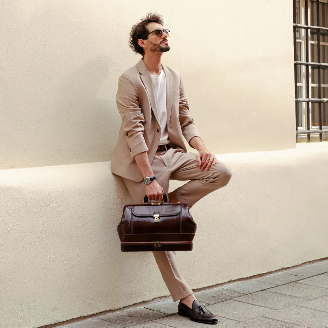 This spring, we invite you to experience a new kind of love: a love between you and your bag. Our latest photoshoot is a tribute to this special bond that transcends time and space. Our leather bags are more than just accessories. They are companions, confidants, and soulmates. They reflect your inner beauty and express your outer style. They are with you through thick and thin, through joy and sorrow, through work and play. They are the ones who make you feel alive and complete. Our photoshoot captures the magic of spring: the freshness of the air, the warmth of the sun, the vibrancy of the city. The model is a vision of elegance and charm, wearing a suit that matches his bags and his mood. The background is a stunning contrast of light and dark, with subtle touches of modernity and history. The photoshoot is a romance between you and your bag. It shows that you don’t need anyone else to make you happy. You just need yourself and your bag. So go ahead and indulge in a spring fling with our leather bags.