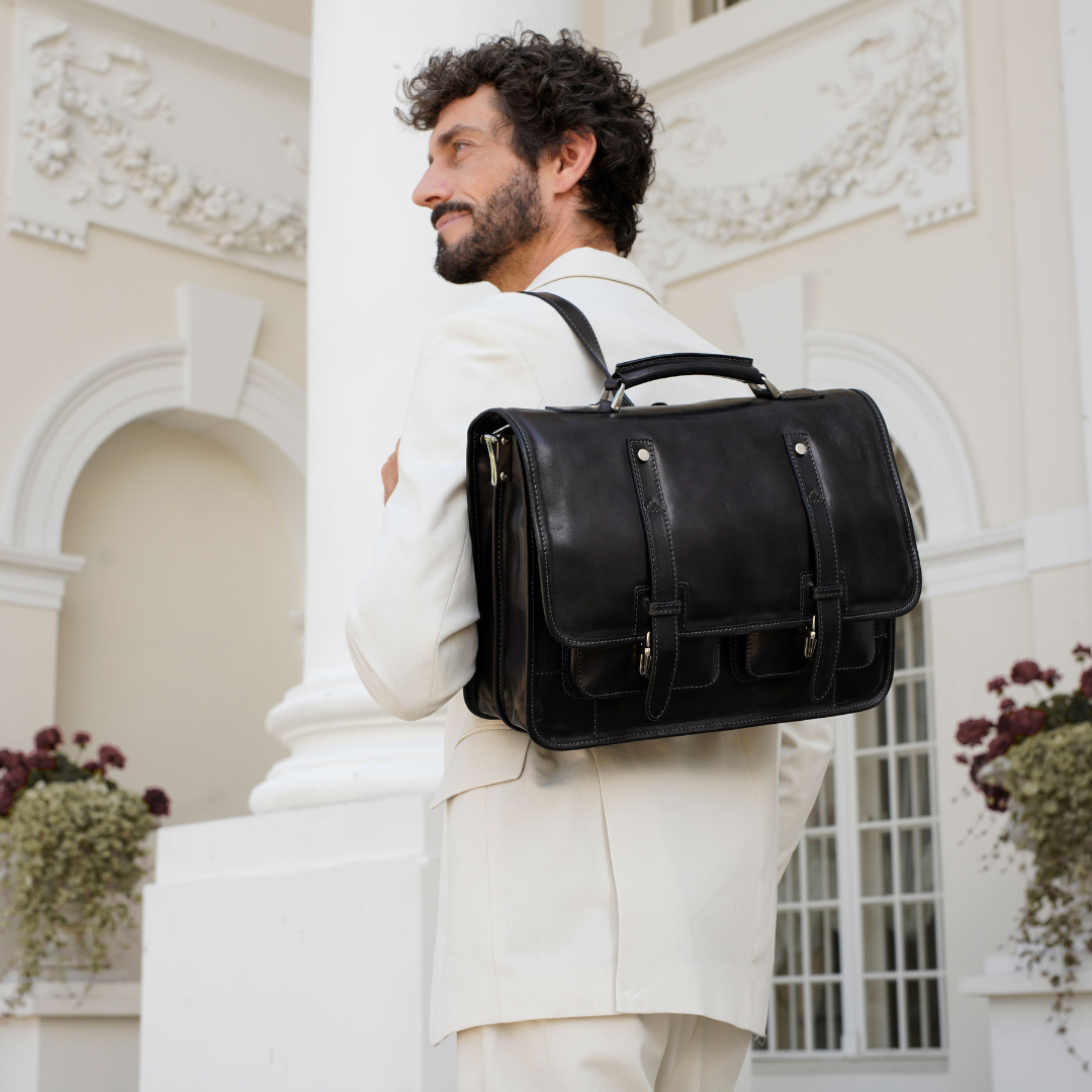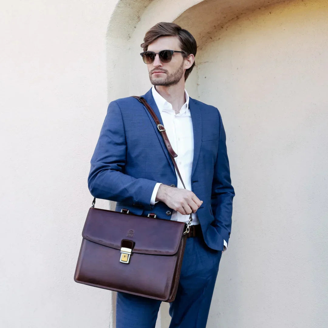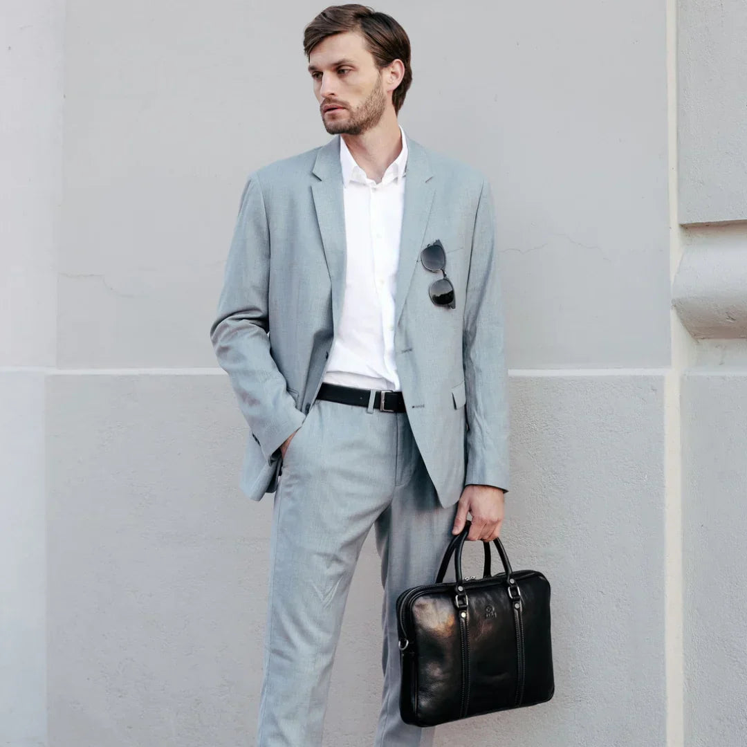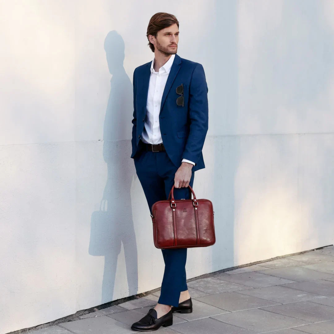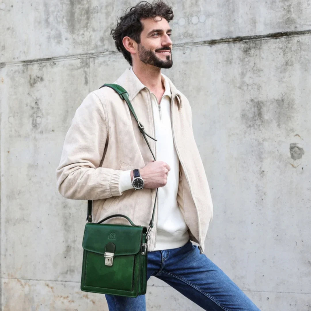 This spring, we invite you to experience a new kind of love: a love between you and your bag. Our latest photoshoot is a tribute to this special bond that transcends time and space. Our leather bags are more than just accessories. They are companions, confidants, and soulmates. They reflect your inner beauty and express your outer style. They are with you through thick and thin, through joy and sorrow, through work and play. They are the ones who make you feel alive and complete. Our photoshoot captures the magic of spring: the freshness of the air, the warmth of the sun, the vibrancy of the city. The model is a vision of elegance and charm, wearing a suit that matches his bags and his mood. The background is a stunning contrast of light and dark, with subtle touches of modernity and history. The photoshoot is a romance between you and your bag. It shows that you don’t need anyone else to make you happy. You just need yourself and your bag. So go ahead and indulge in a spring fling with our leather bags.