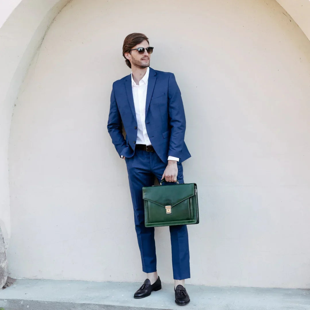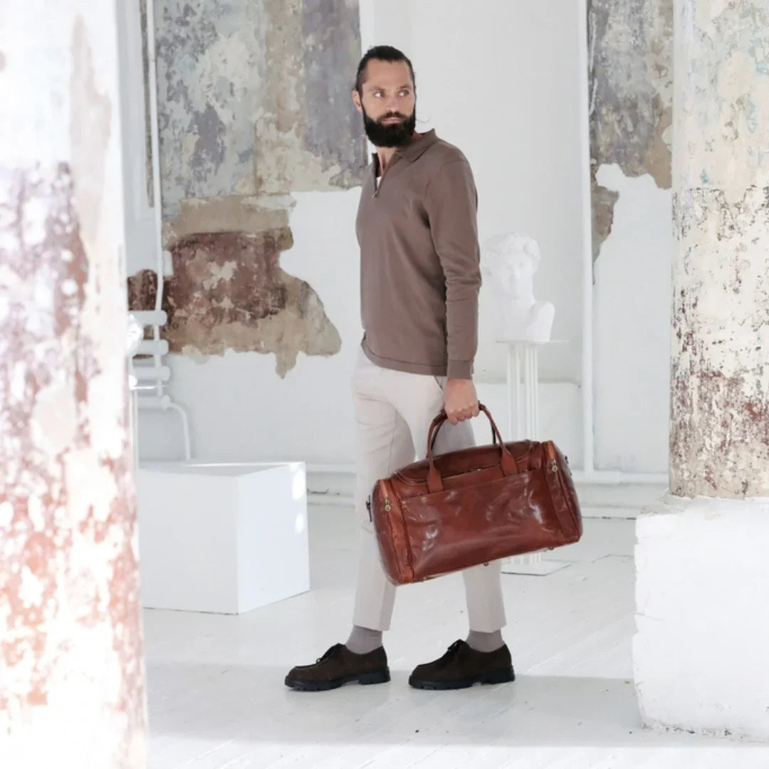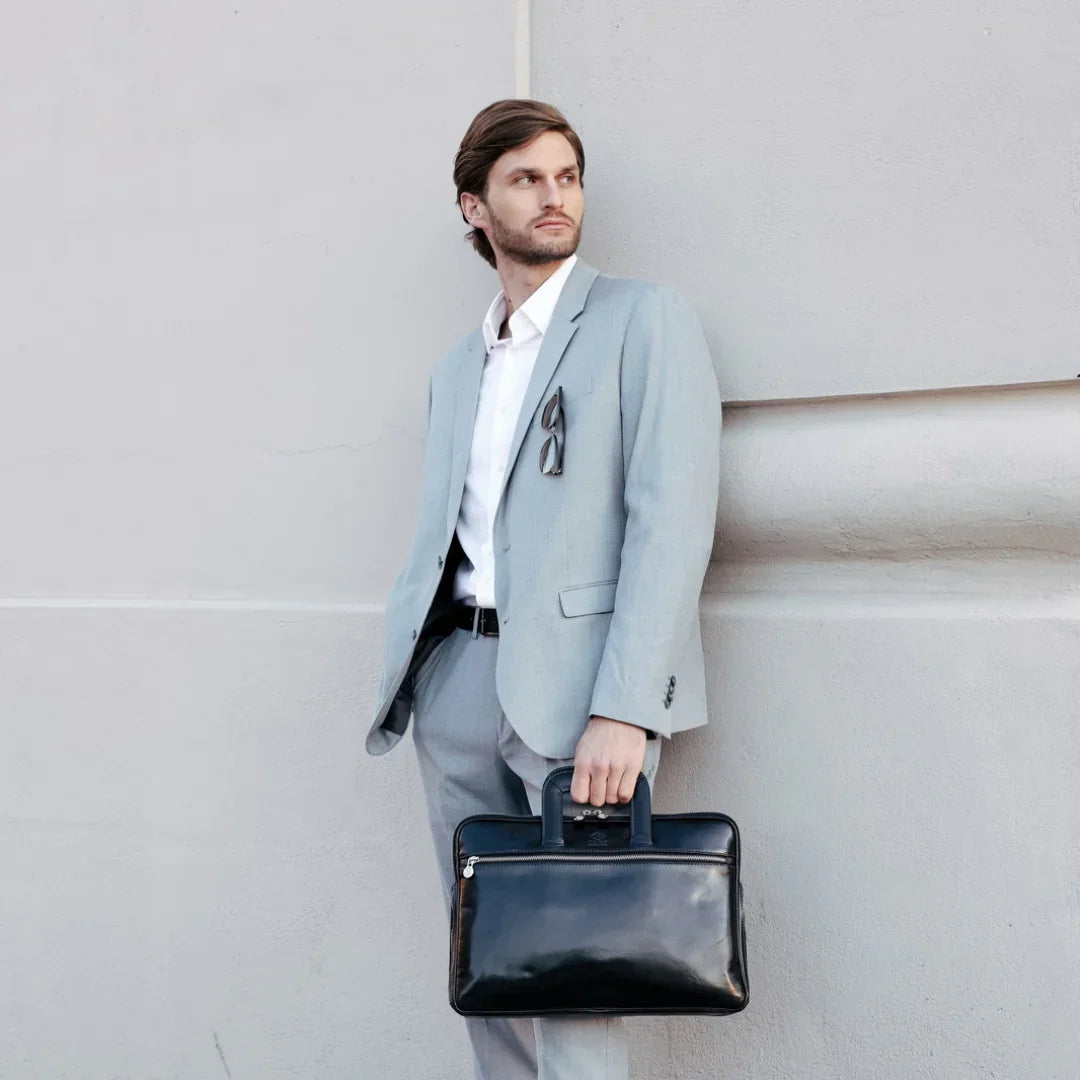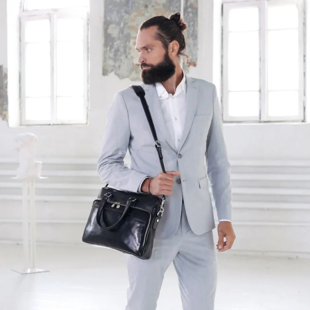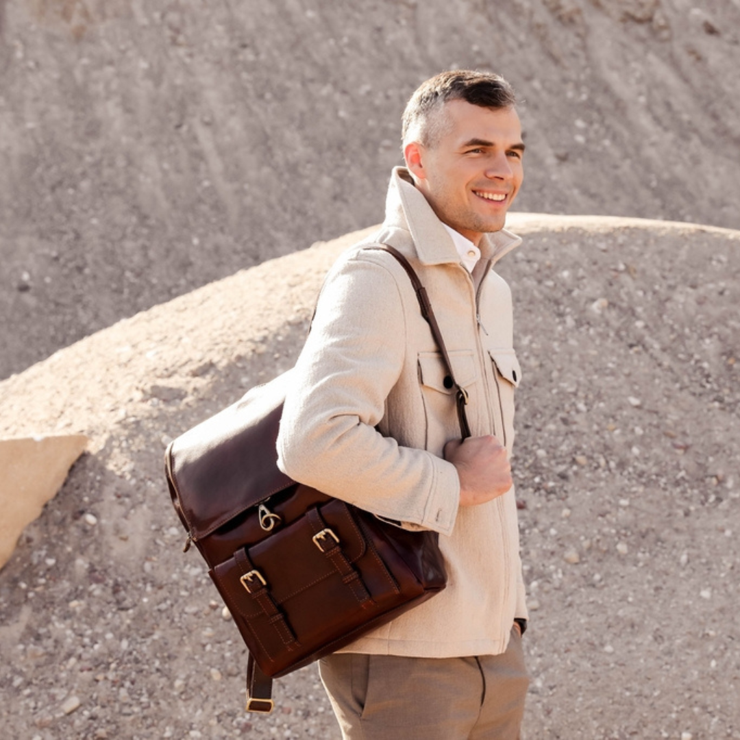 This spring, we invite you to experience a new kind of love: a love between you and your bag. Our latest photoshoot is a tribute to this special bond that transcends time and space. Our leather bags are more than just accessories. They are companions, confidants, and soulmates. They reflect your inner beauty and express your outer style. They are with you through thick and thin, through joy and sorrow, through work and play. They are the ones who make you feel alive and complete. Our photoshoot captures the magic of spring: the freshness of the air, the warmth of the sun, the vibrancy of the city. The model is a vision of elegance and charm, wearing a suit that matches his bags and his mood. The background is a stunning contrast of light and dark, with subtle touches of modernity and history. The photoshoot is a romance between you and your bag. It shows that you don’t need anyone else to make you happy. You just need yourself and your bag. So go ahead and indulge in a spring fling with our leather bags.