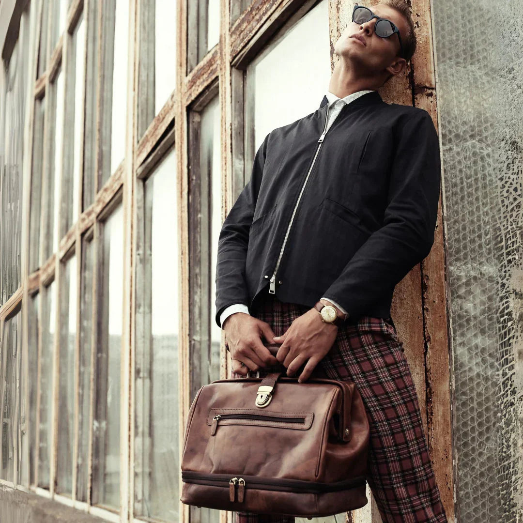 We have always believed that classy leather bags are not for only stuffy business man, cool guys can wear them as well without loosing their swag. This is what we tried to prove with the photoshoot called Opposites Attract. Some shoots were taken in an old manor and the classic design doctor bags really brought us back in time for a moment. Then we moved to a skating park near some office buildings where many young guys like our handsome model actually work. The bags really accustomed to the new habitat and transformed the man into an edgy millennial.