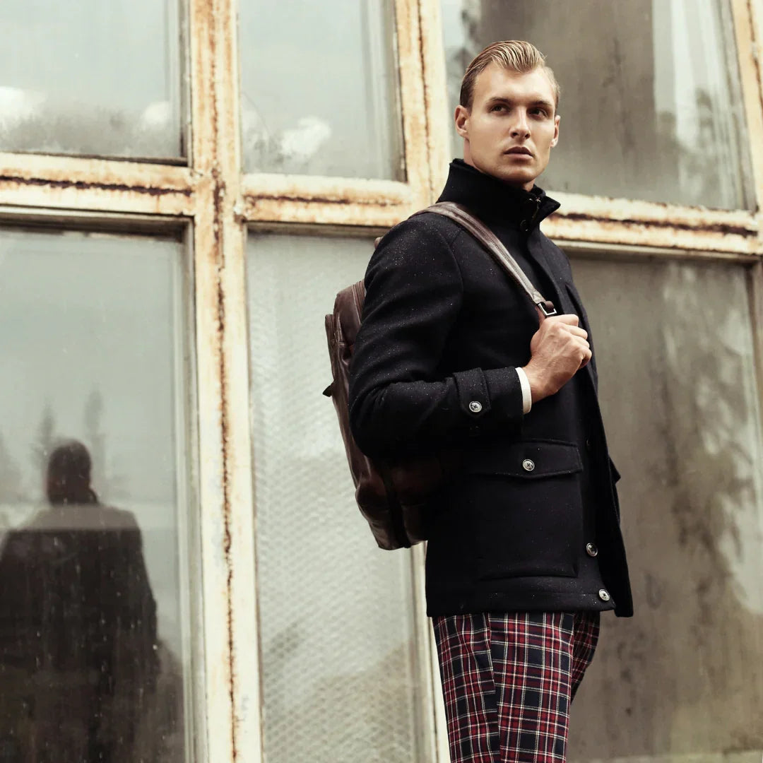 It‘s all about the versatility of leather bags. We really went wild with this one, story-wise of course. He is a secret agent working on one of his cases, infiltrating and observing. Different locations, from corporate headquarters to a train station to an abandoned nuclear plant, perfectly disguised and ready to strike.