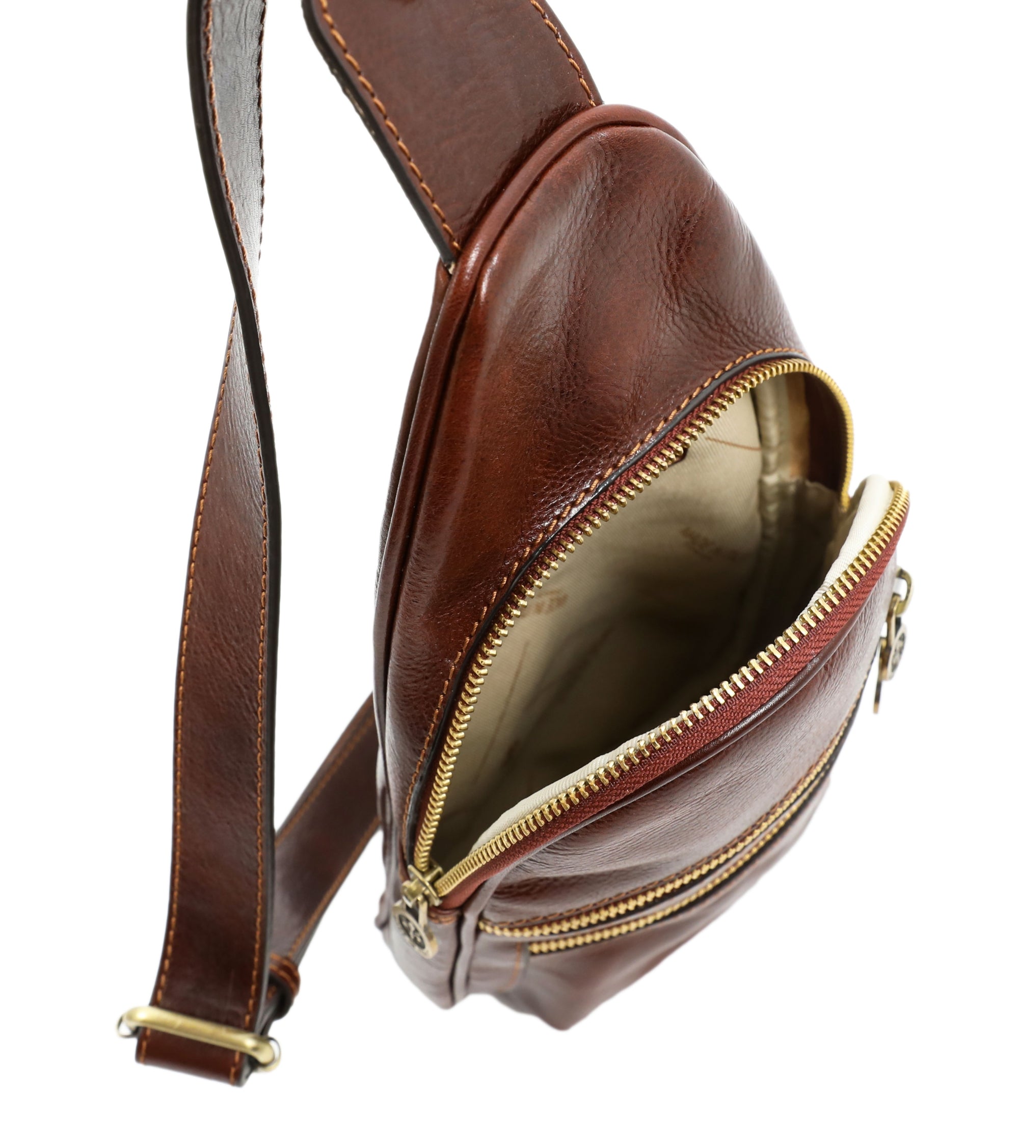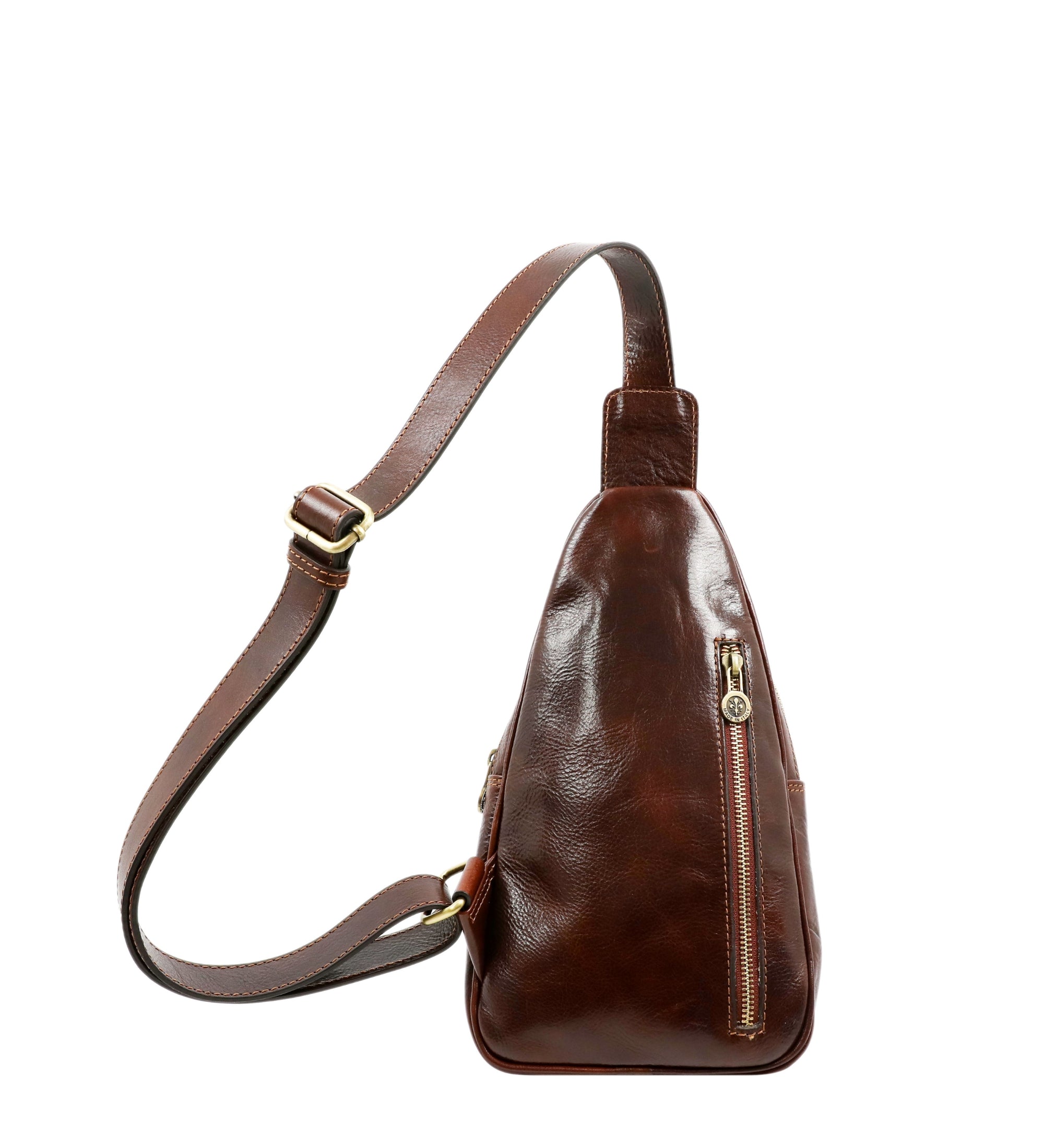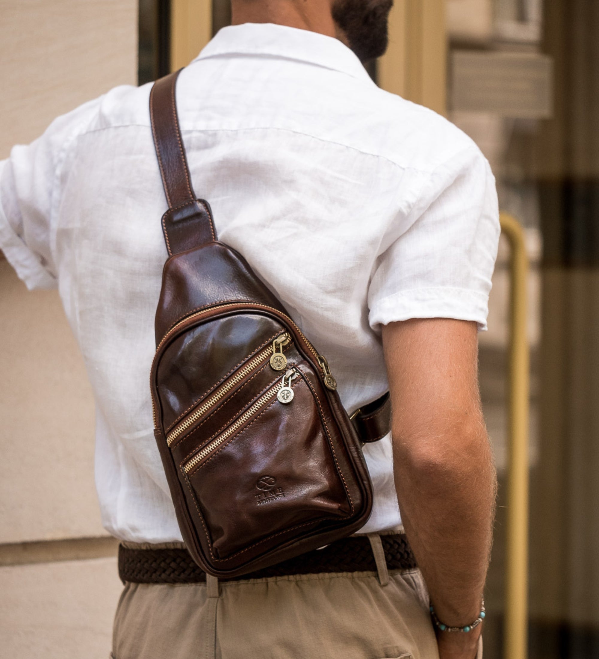 This Italian leather sling bag was designed to maximize the comfort of traveling. Our full-grain leather chest bag Catch-22 can be carried on the chest and on the back. Close to the body premium quality fanny pack does not restrain movements nor spirit of traveling.
