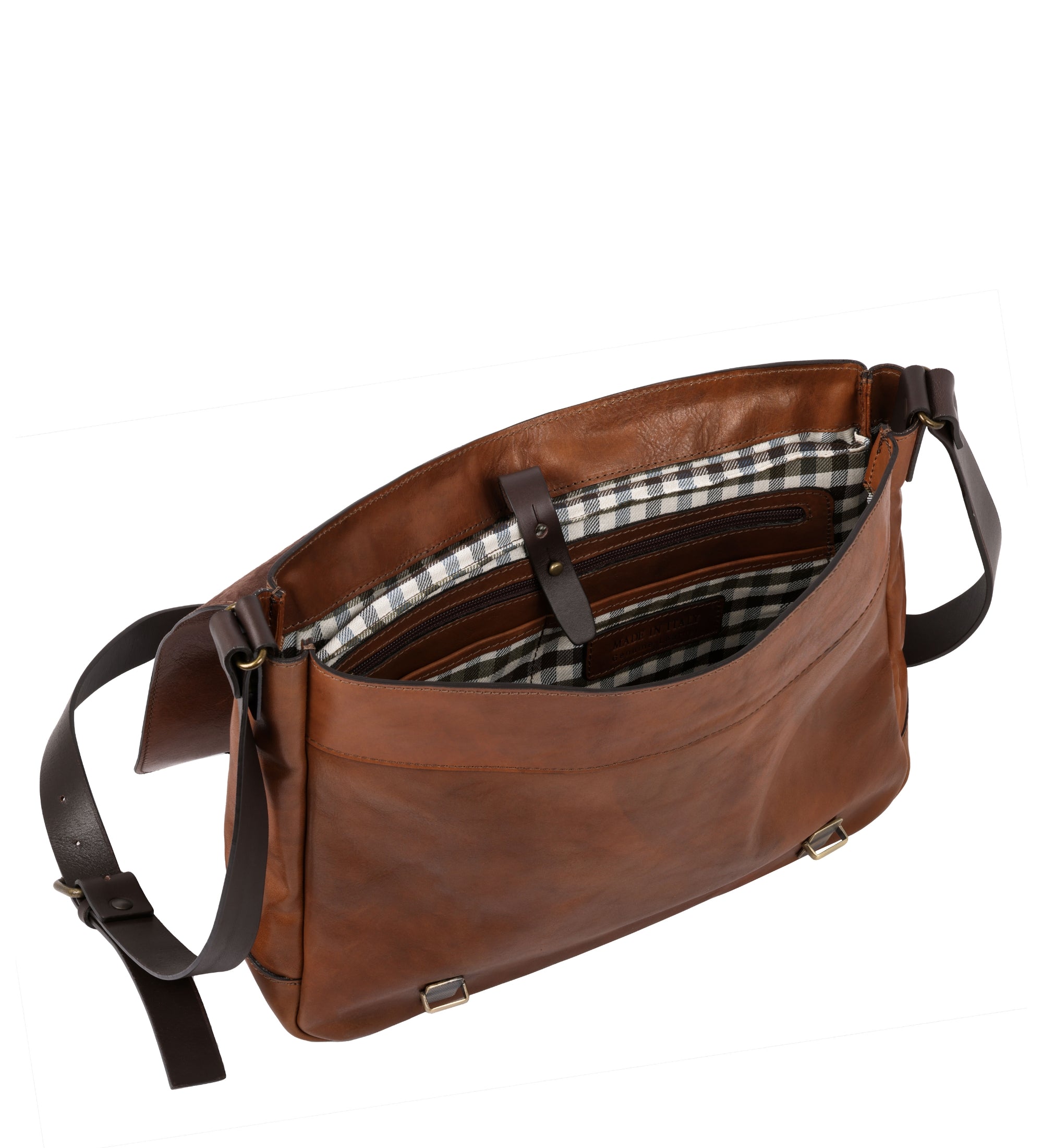 Full-grain Italian leather messenger bag I Capture the Castle is the most comfortable messenger bag you will ever have. Tuck lock closures allow for quick access to a spacious shoulder bag that fits a laptop, document folders, and your lunch. Plenty of pockets inside will accommodate your smaller belongings like a smartphone, a wallet, keys, and much more. Vintage in spirit this leather messenger bag is made for a modern city man.