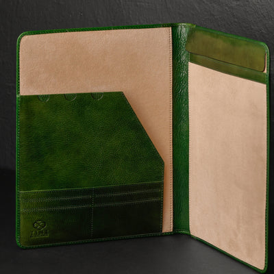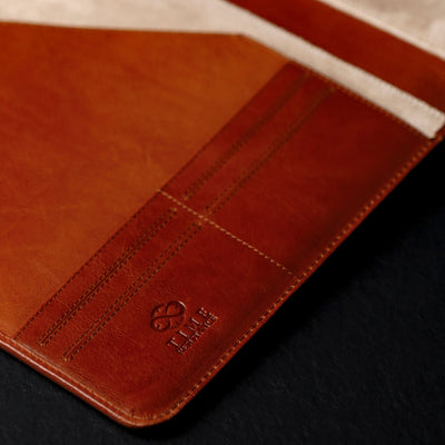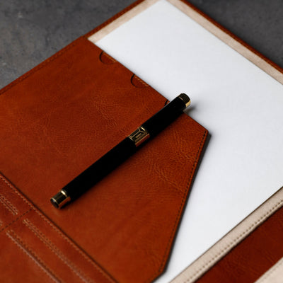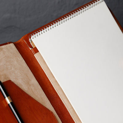 Whether you're preparing paperwork for a high-stakes presentation or safeguarding your tablet for a crucial meeting, this portfolio ensures that you're always prepared to make a lasting impression. Nestled within its sleek exterior is a spacious interior, lined with gentle material that cradles your devices and papers, protecting them from scratches and damage. With multiple pen loops and thoughtful card slots, every detail is carefully considered to streamline your workflow and elevate your organizational prowess. Elevate your professional persona with our Leather Portfolio—the epitome of functionality, and ambition.